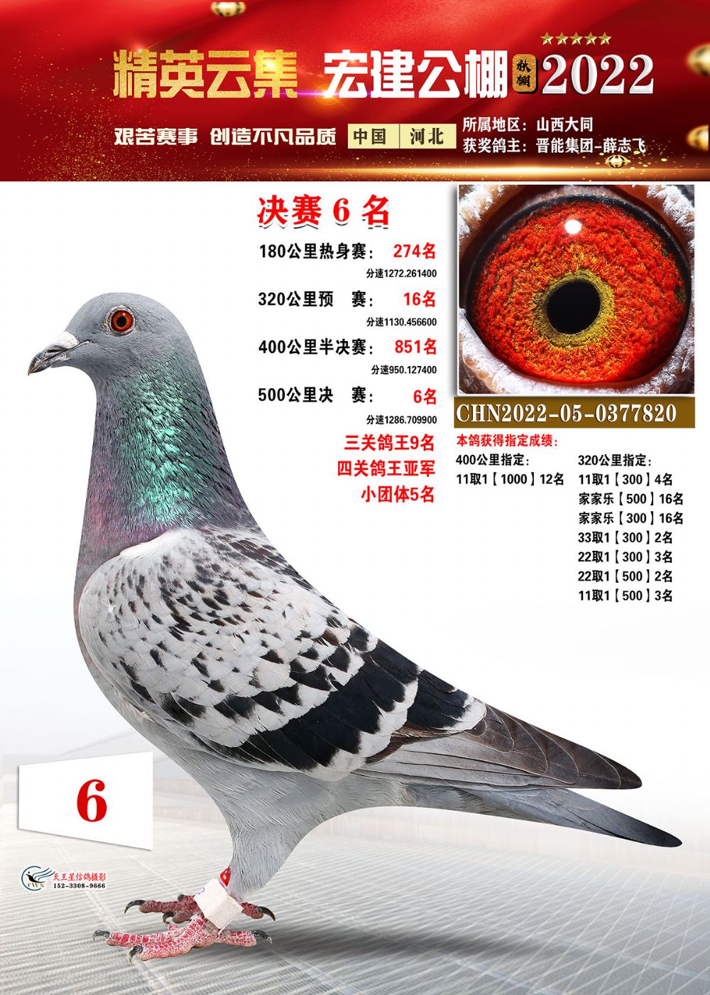 11月7日,500公里决赛在内蒙古阿尔善油田放飞,4684羽参赛鸽向着最后的总冠军进发,在有效时间内,共计归巢2775羽,归巢率59%。冠军是郭怀林2022-03-2784492的雨花鸽,分速1294.4392米/分;亚军是胜翔轩-高飞2022-03-2244809的灰鸽,分速1289.0579米/分;季军被丁飞2022-03-2826473的灰鸽斩获,分速1288.7984米/分。三关鸽王桂冠被张月清2022-03-2930409的雨点鸽摘得,三关成绩分别为:300公里458名、400公里21名、500公里29名。