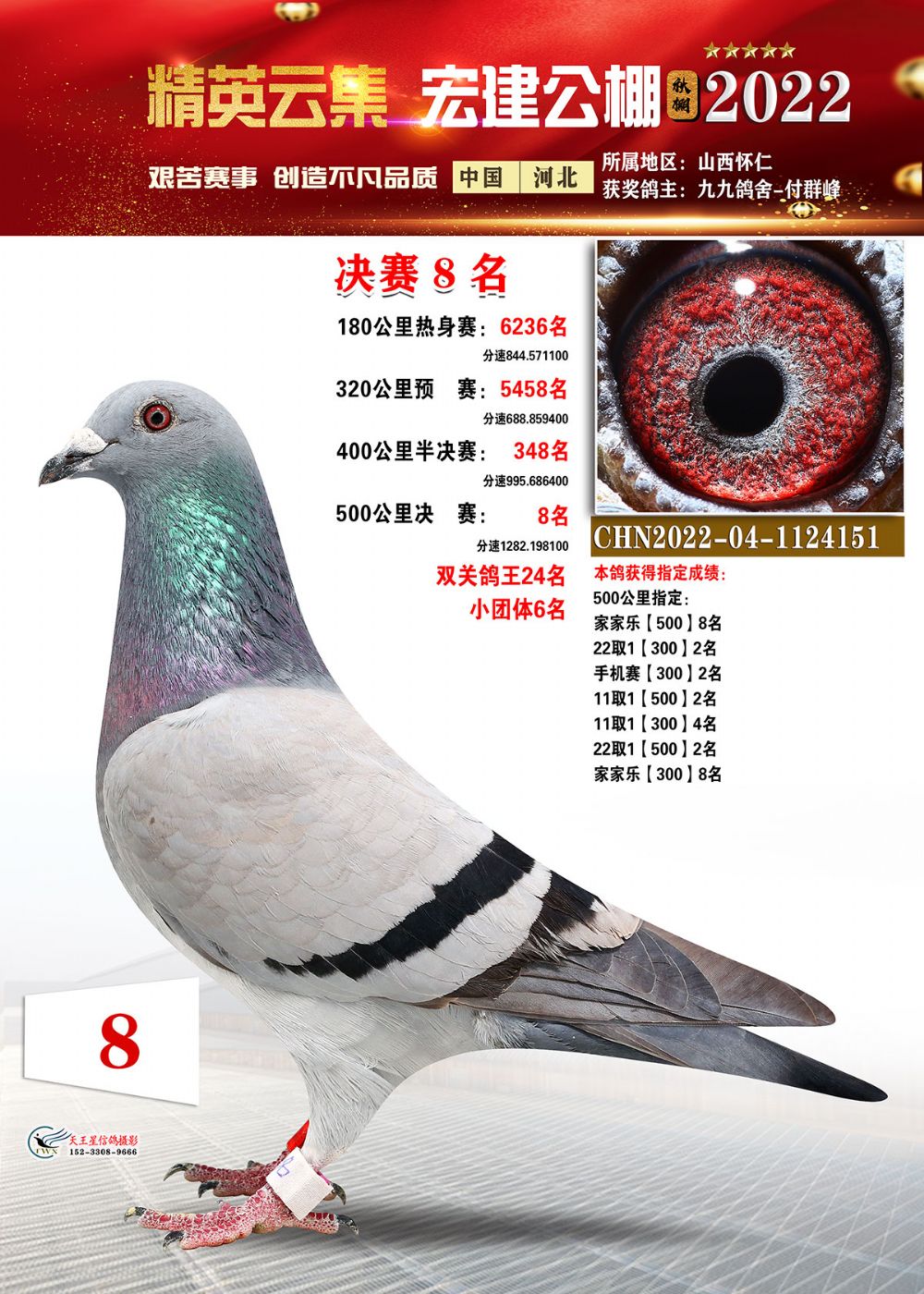 11月15日,双关加站赛首关505公里比赛在内蒙古阿尔善油田放飞,共有1870羽赛鸽参赛,归巢687羽,冠军是宏腾石业-王国栋2022-04-0411136的灰鸽,分速1214.2878米/分。从180公里热身赛到500公里决赛,再到一关加站赛,五场高分速归巢,五战五胜,缔造赛场佳话。加站赛第二关将于11月21日开笼,敬请期待!