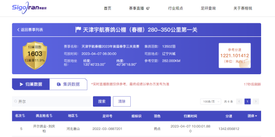 孙代获2022年北国之春公棚秋棚小棚第三关500公里决赛第6名,精英赛亚军,赢得奖金36万元(鸽友:超捷运输有限公司-李杨)!