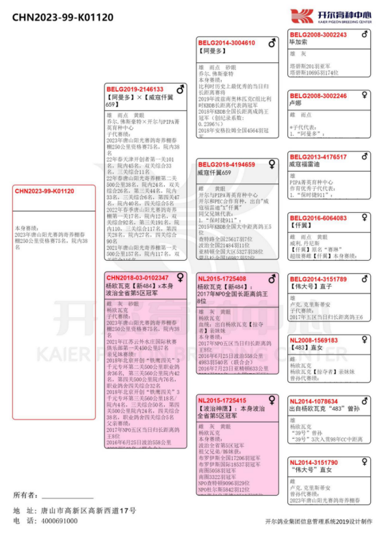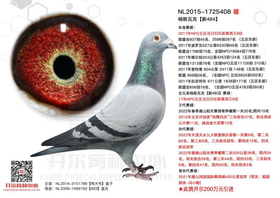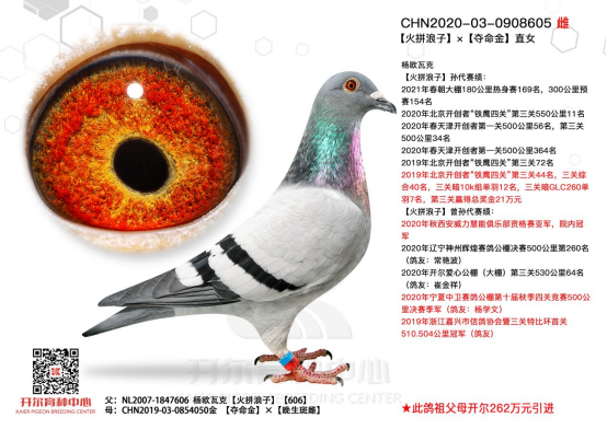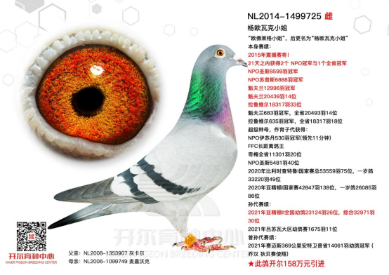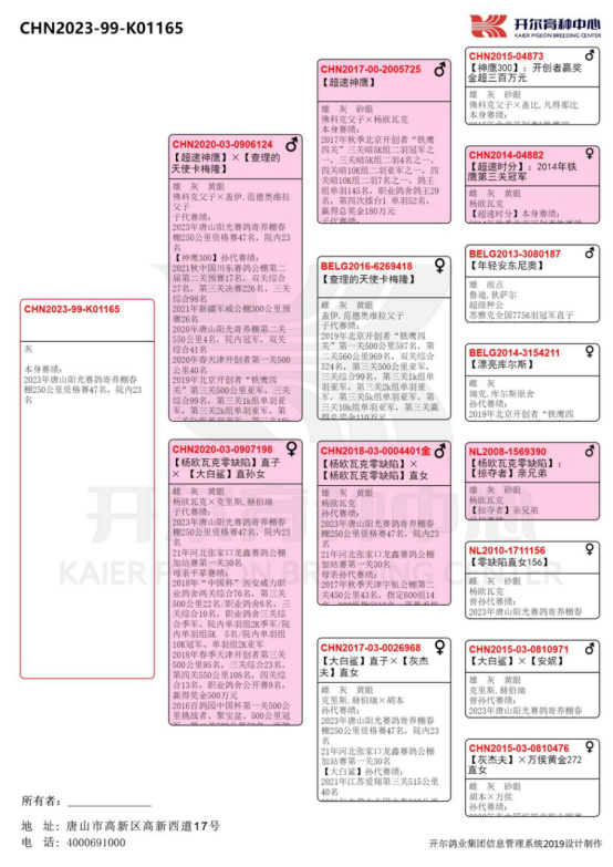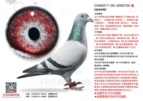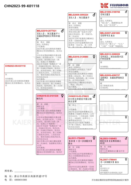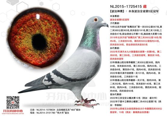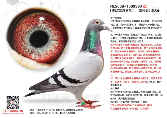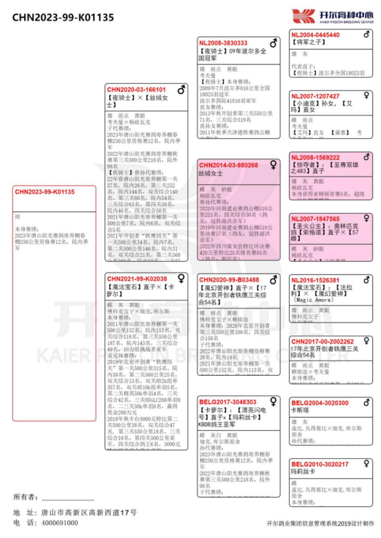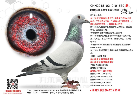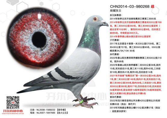 K01135的祖母【丝绒女士】出自【483】“四大财子”之首,本身获得亚精顿省赛5名,超级一日长距离雄鸽【掠夺者】与奥林匹克鸽【索格诺】直子作育的【圣火公主】!