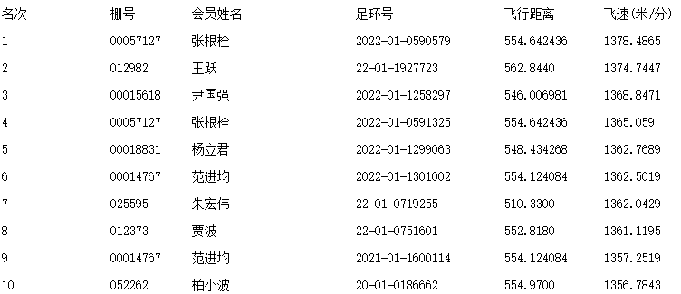 在一众参赛豪强中,张根栓表现格外亮眼。他的环号2022-01-0590579的小将以1378.4865米/分的成绩斩获冠军,同时拿下北京全市联翔26483羽总冠军,空距554公里。