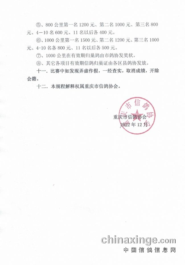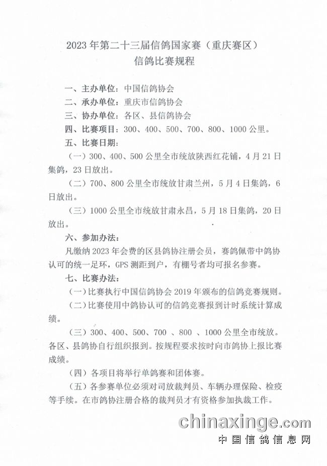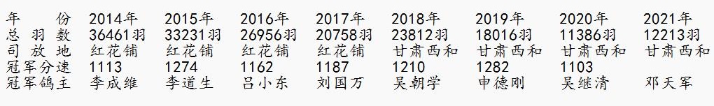 在2021年的重庆市国家赛中,共有12213羽信鸽参赛,冠军是来自北碚的邓天军鸽友,分速1293.68米/分。