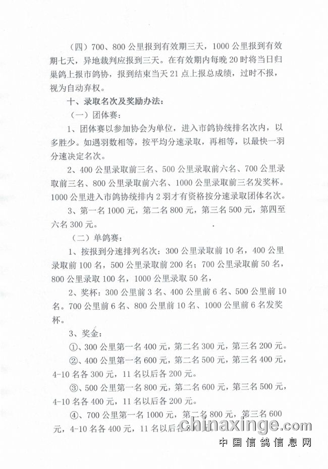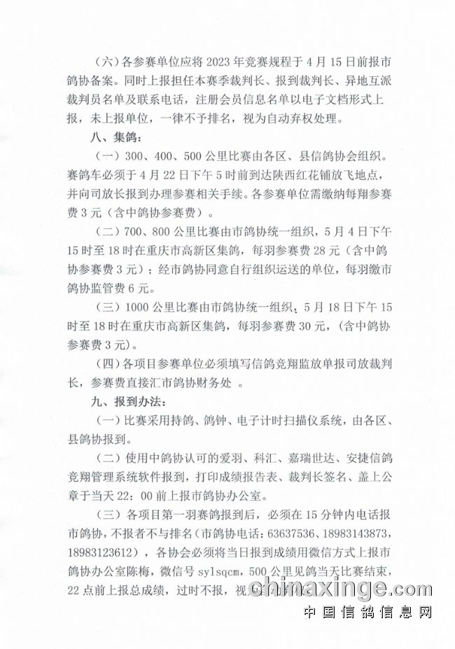 比赛项目分为300、400、500、700、800、1000公里,首先开始的是中短距离的比赛,全市统放陕西红花铺,4月21日集鸽,23日放出。300公里录取前10名,400公里录取前100名,500公里录取前200名。虽然是中短距离,但沿途山区地形环境多变,天气变化快,难度极大,十分考验赛鸽的品质。千公里预计在5月20日开笼。