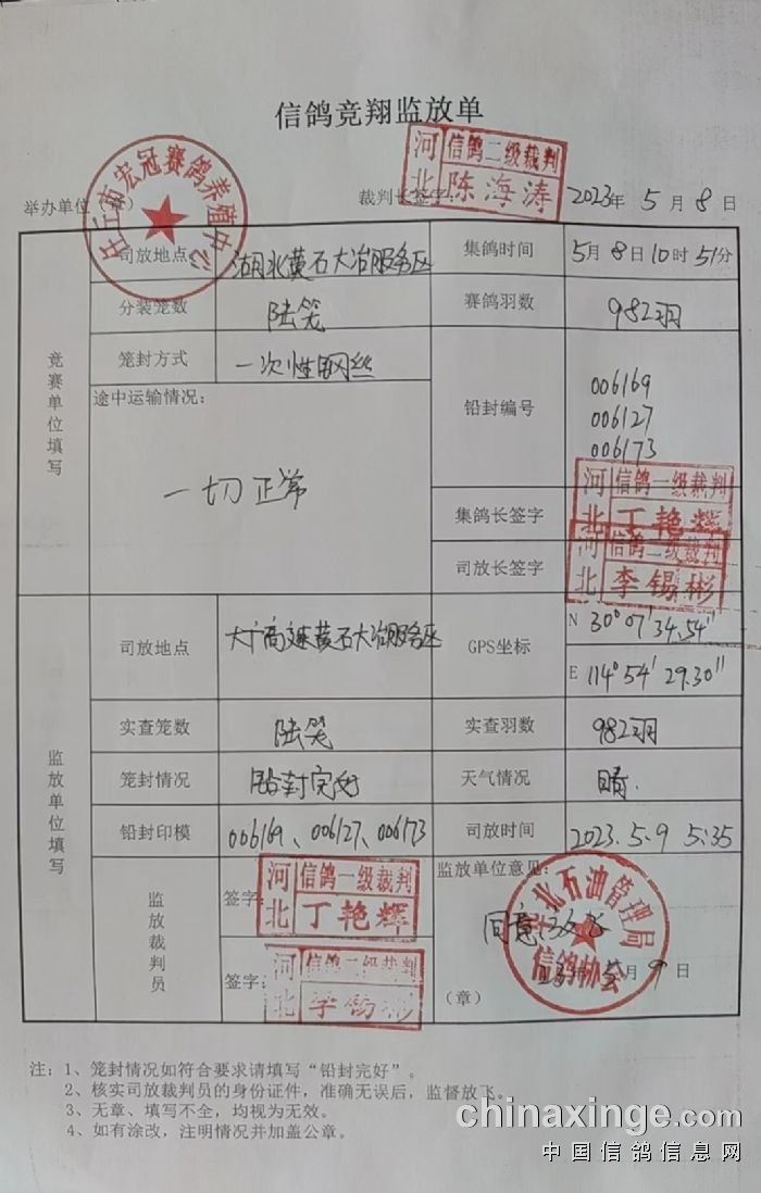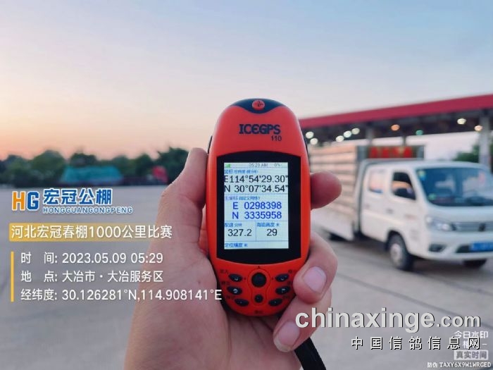 5月9日,公棚再度出击,开启1000公里极限挑战赛。早上5:35,982羽赛鸽在湖北黄石大冶服务区放飞,实际空距960公里。