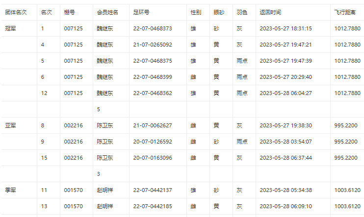 晚上19点30分之后,冠军得主魏继东连续报到两羽赛鸽。半小时过后,20点29分,他又报进一羽赛鸽,一人当日归巢四羽赛鸽,分别获得冠军、4、5、6名。