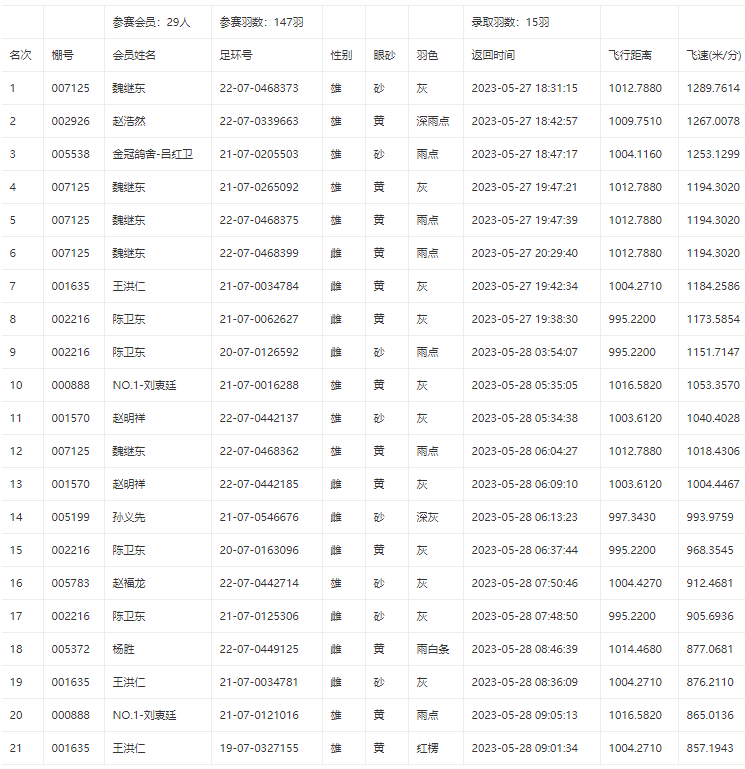 2023年长春市信鸽协会春季1000公里比赛,于27日5:26在内蒙古商都开笼,与吉林省国家赛暨全省联赛同场竞技。比赛共计参赛会员29人,集鸽153羽,其中包含6羽训放,赛区总羽数847羽。