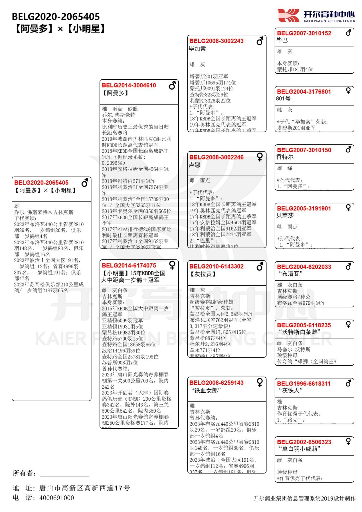 2089740的父亲同样来自阿曼多的后代,是由阿曼多和15年KBDB全国大中距离一岁鸽王冠军【小明星】共同作育。