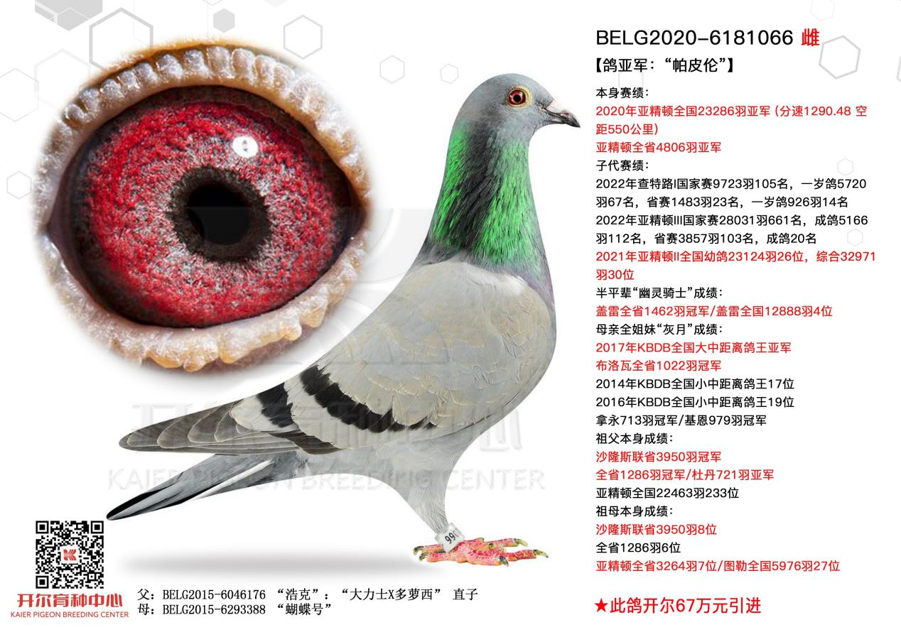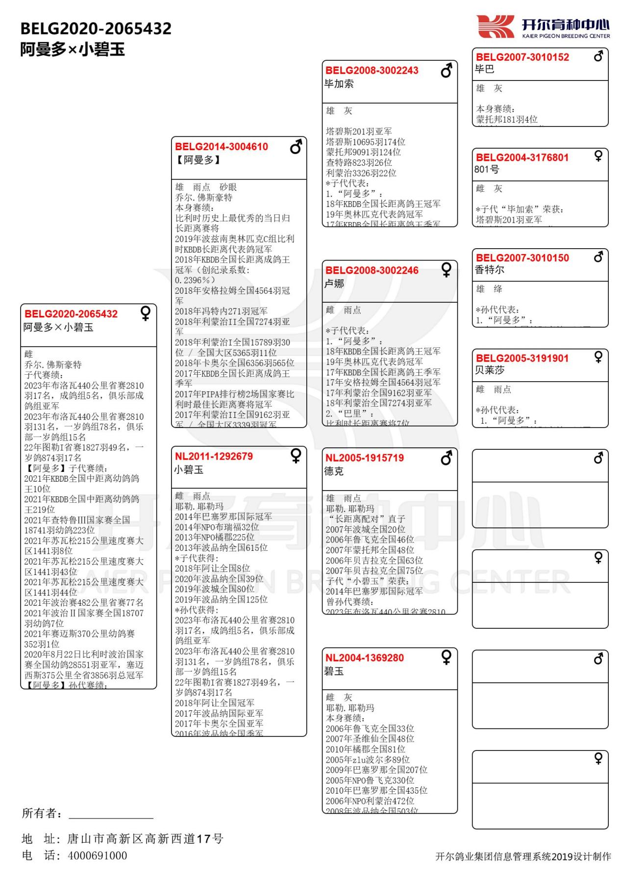 2065033的父亲是气球号全兄弟【霸龙兄弟】,同样也是盖比【闪电号】直女的后代,其自身作育的后代也都取得优秀赛绩,子代获得2023年布洛瓦440公里省赛成鸽组86名,俱乐部成鸽组14名,22年PIPA排行榜比利时全国赛8场比赛最佳成鸽鸽王11位的成绩。