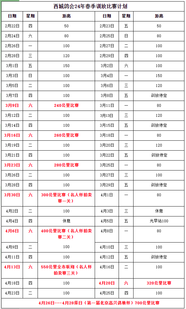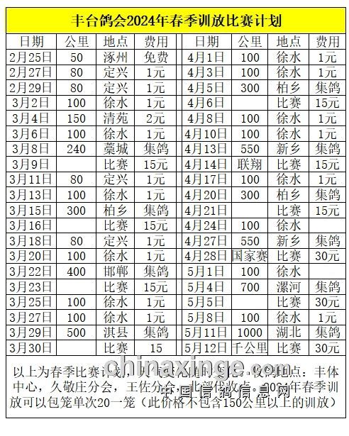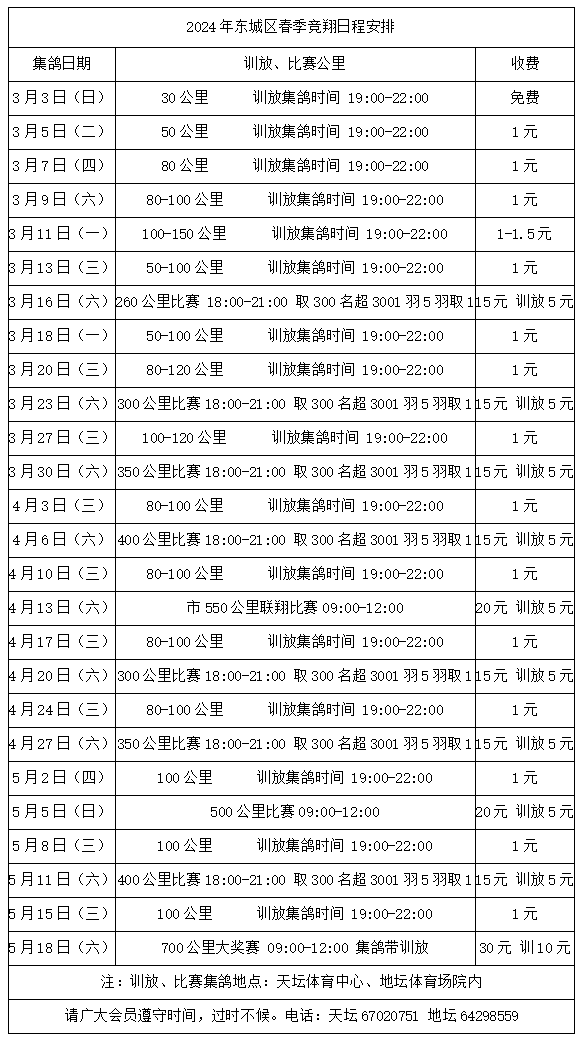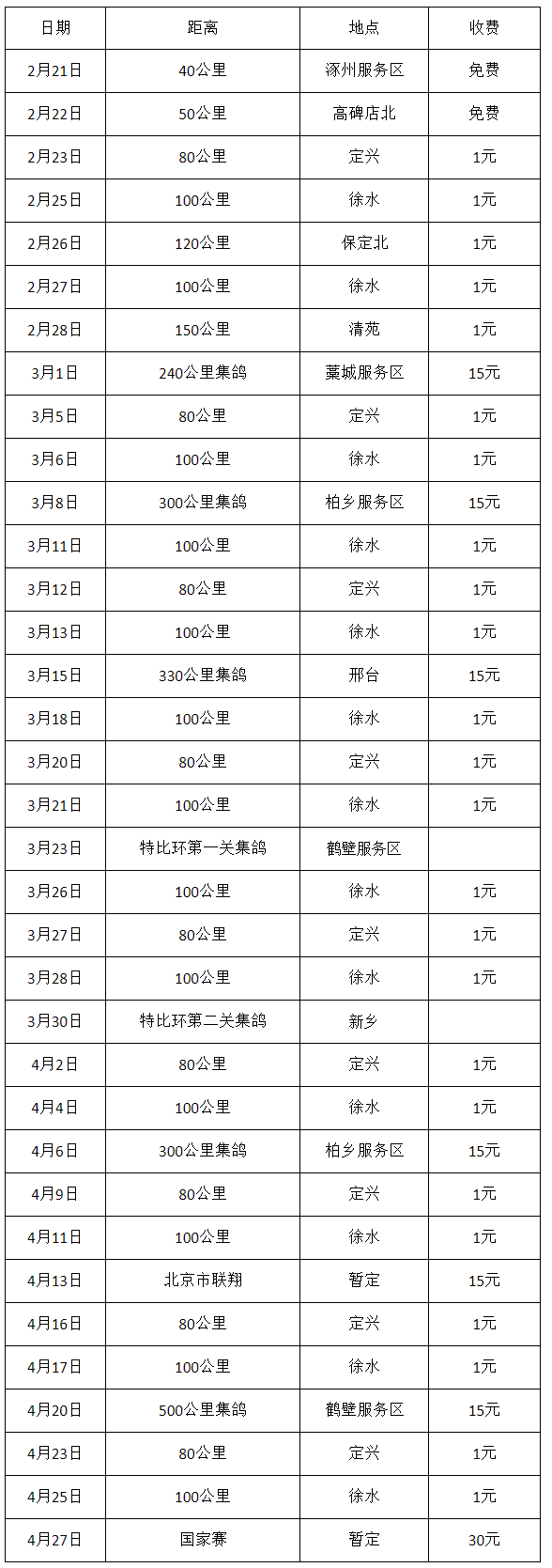 日前,北京市丰台、房山、东城、西城鸽会,以及多家俱乐部发布了春赛日程表,其中房山、西城鸽会分别于21、22日率先启动,进行免费训放,周末丰台鸽会进行第一站训放。