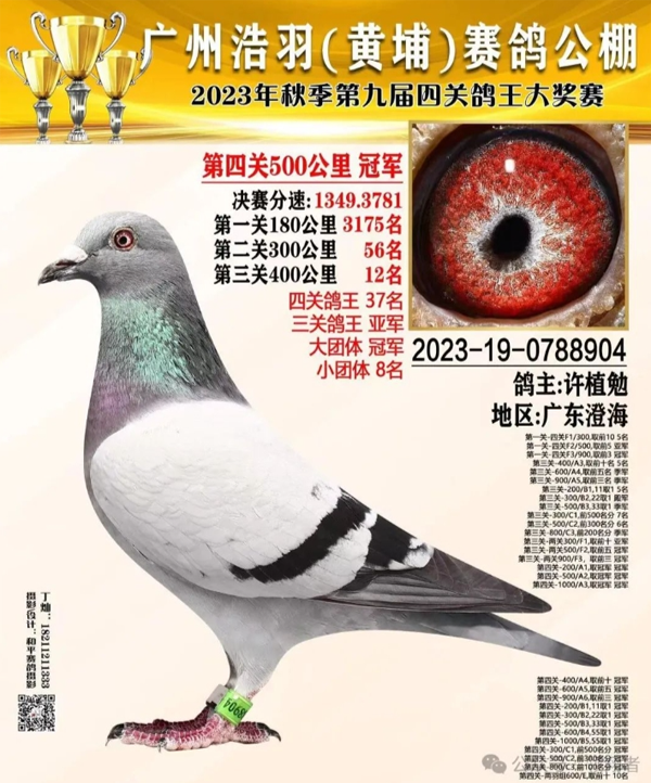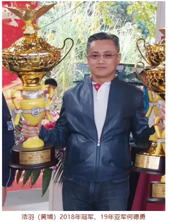 此外还有深圳鸽友何德勇,他专注于浩羽(黄埔)公棚的比赛,以浩羽一羽加站赛8名作育参赛,从入赏到夺冠,在浩羽(黄埔)多年获得高位奖项,使他在这个赛场上飞成一方名家。近两年他又开始带着这路鸽子出征华北、华东和云南高原赛线。