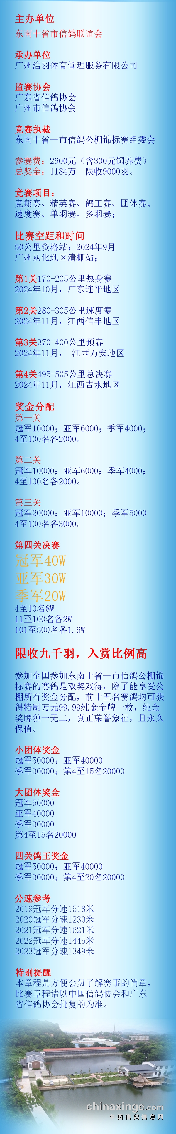 另外,广州浩羽(黄埔)公棚近十年的比赛数据和资料,都保存在公棚在中信网的网站上,您如果想要参赛,可以到网上查看历年信息。广州浩羽(黄埔)公棚