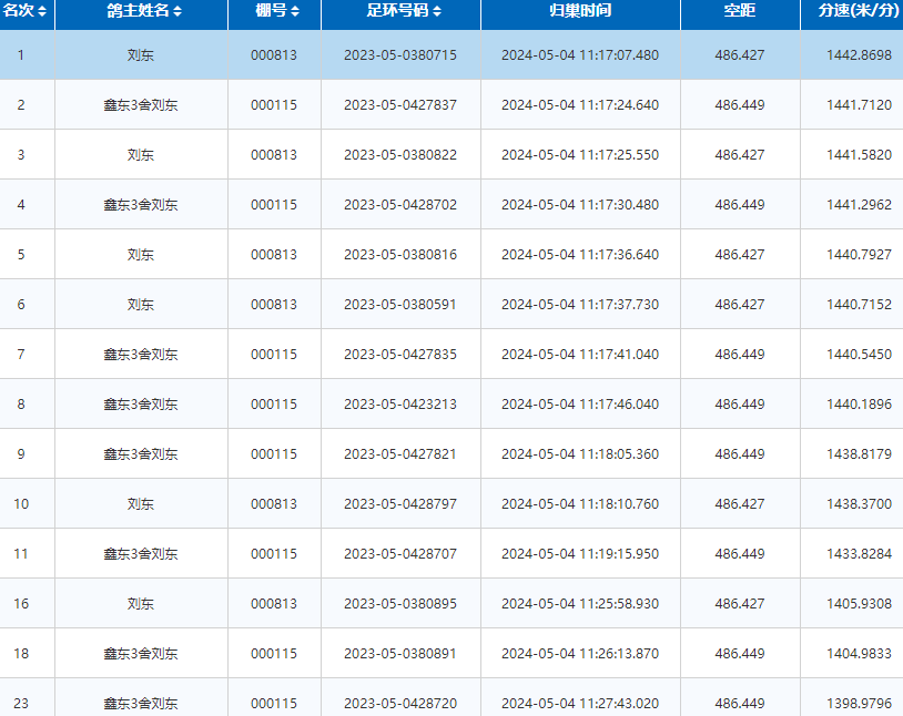 而这场500公里比赛,又一次上演同样的剧情,鑫东鸽舍刘东独揽1-11、16、18、23名等名次,前100名中入围19羽赛鸽,成为最大赢家。比赛飞行空距486.427公里,最高分速为1442.8698米/分。