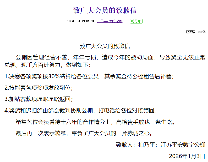 2026年1月4日,江苏平安数字公棚发布《致广大会员的道歉信》,说明“公棚因管理经营不善,年年亏损,造成今年的被动局面,导致奖金无法正常兑现。”