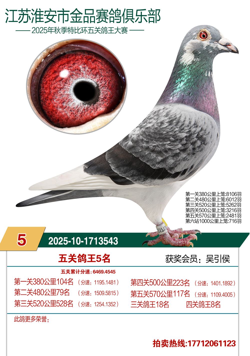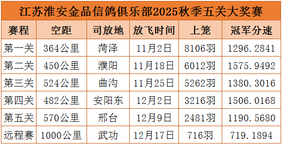 淮安金品俱乐部2025年秋赛三关鸽王1—9名(5羽)