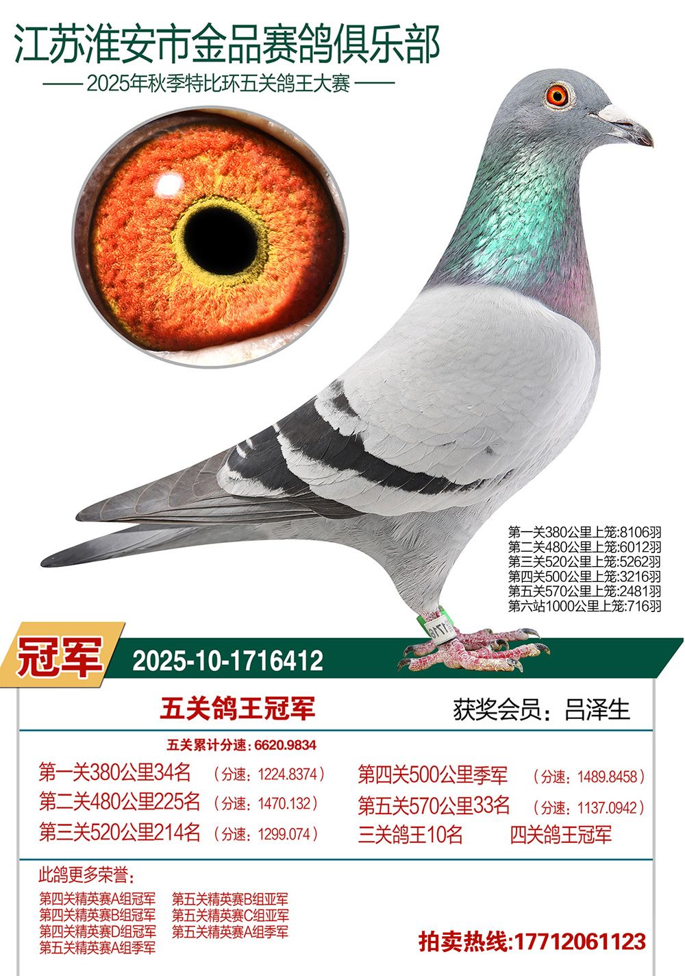 最终,本届秋赛鸽王总冠军花落吕泽生鸽友麾下一羽砂眼灰雄,足环2025-10-1716412。此鸽全程极具爆发且始终发挥稳定:首关第35名,二关228名,三关216名,四关跃升至第3名,五关再以第33名完赛。之后凭借五关总分速6620.9834米/分的成绩,以绝对优势加冕鸽王总冠军,无愧为本届秋赛最强战将。