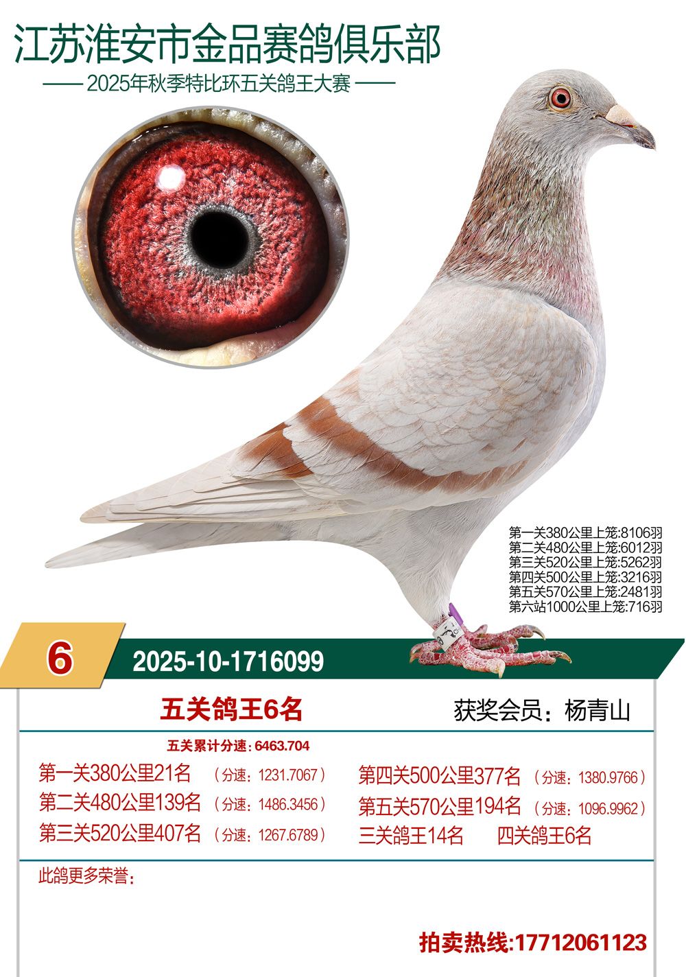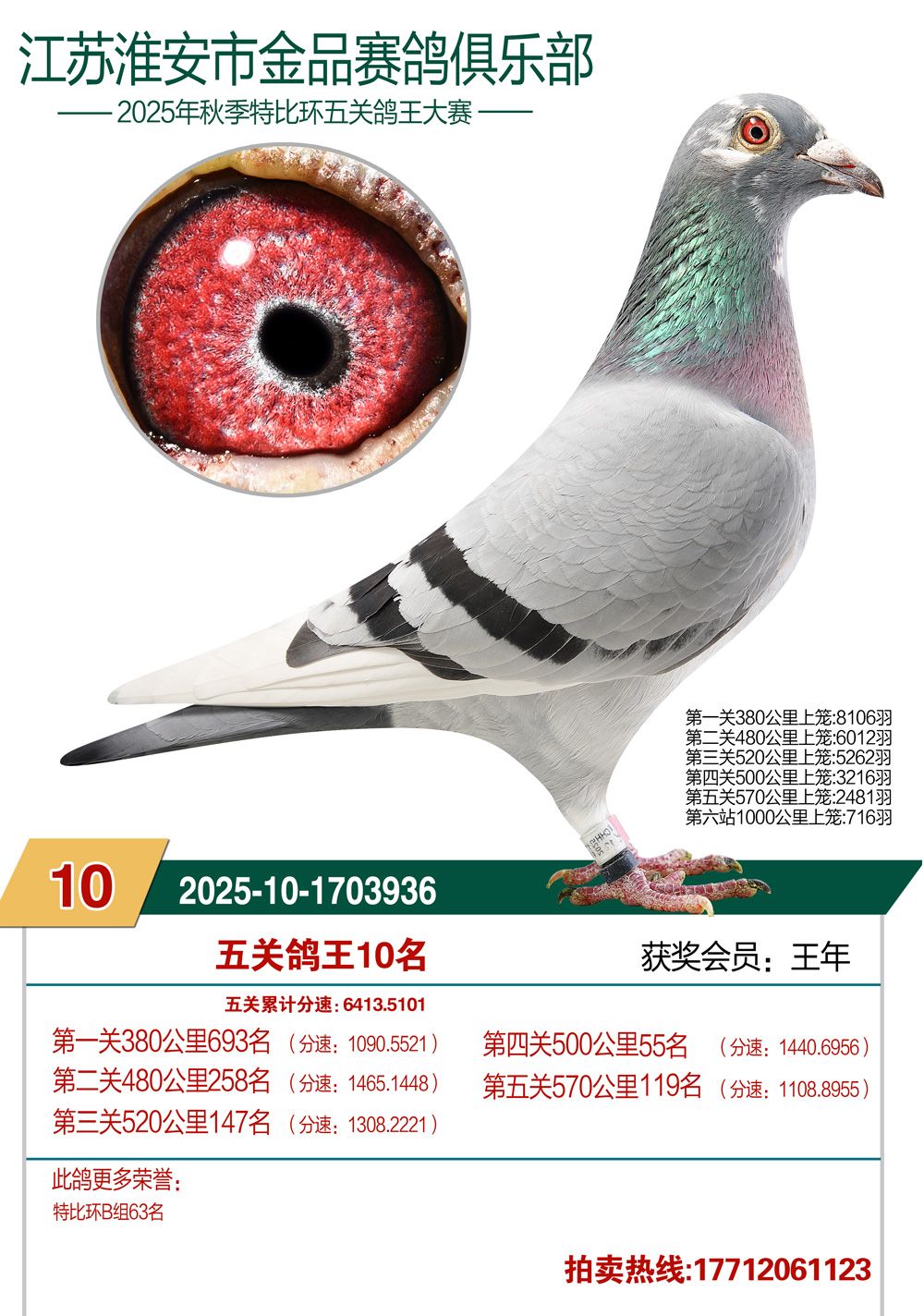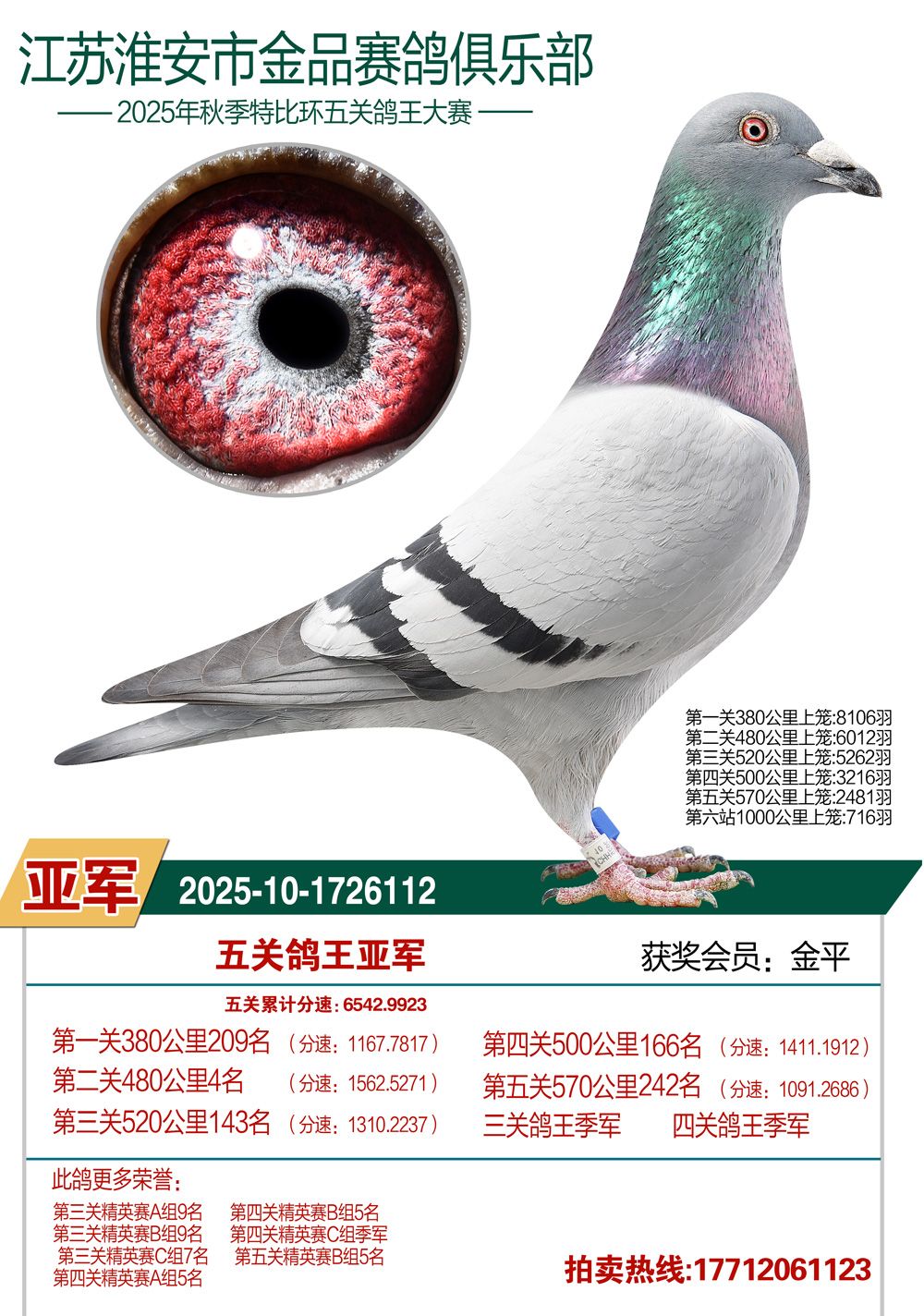 拍卖顺序:单关14羽、决赛1—200名、三关鸽王5羽、五关鸽王1—100名、千公里1—12名