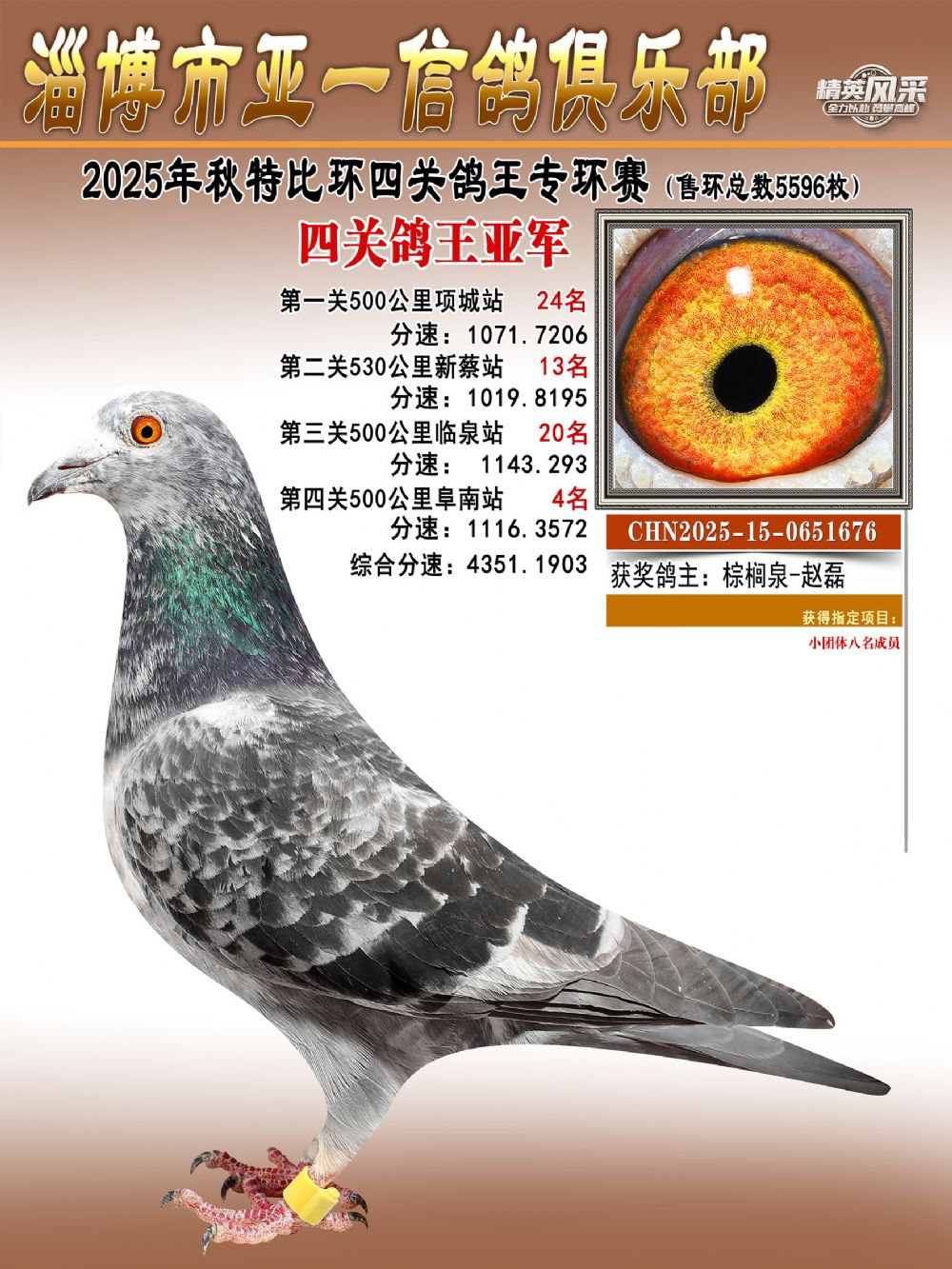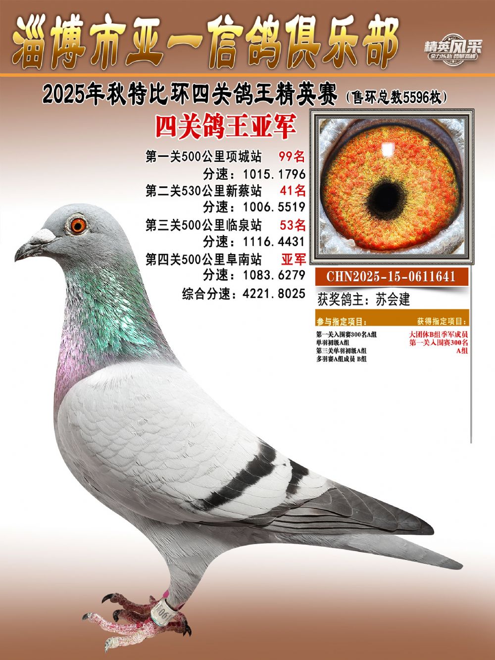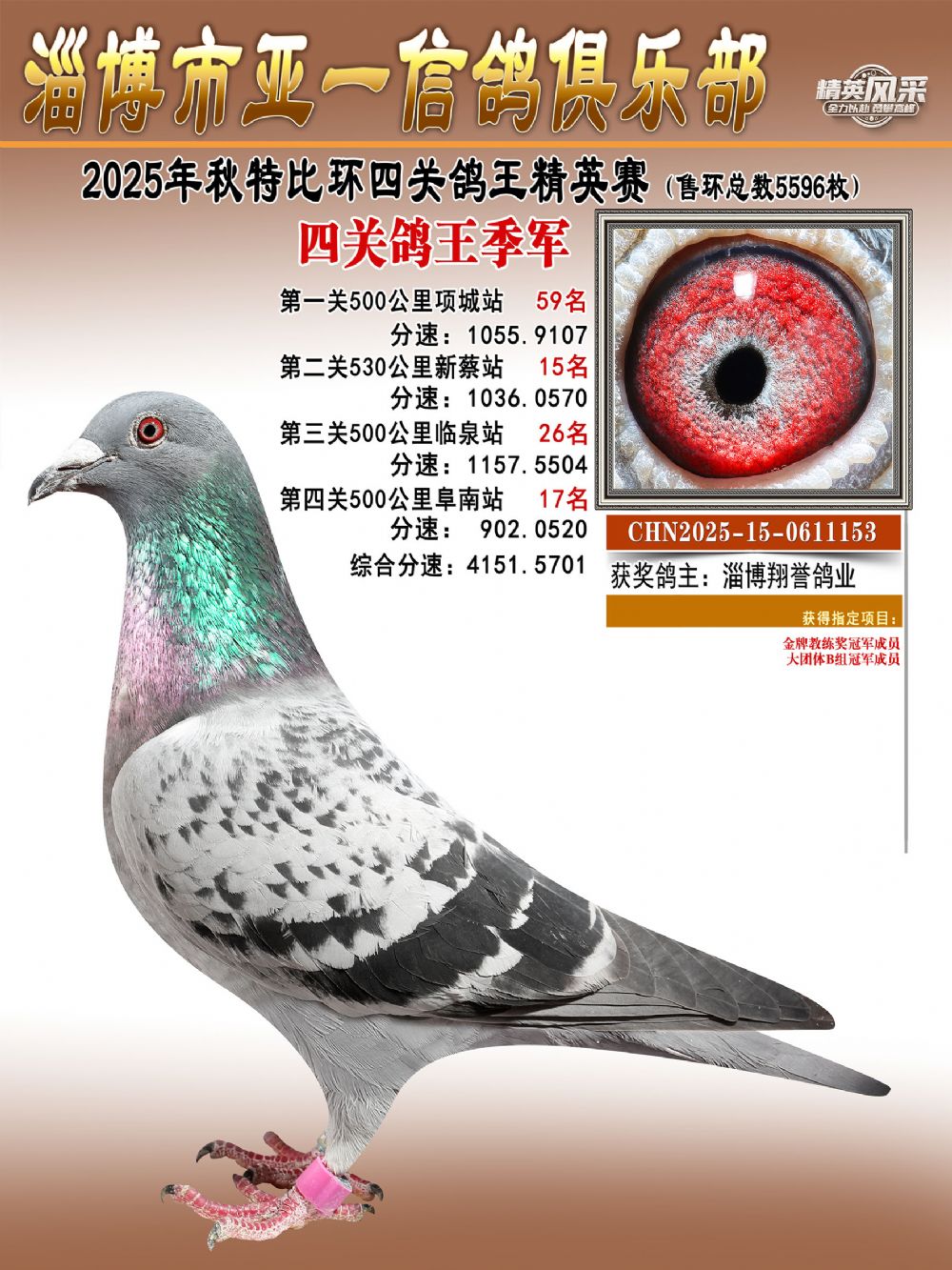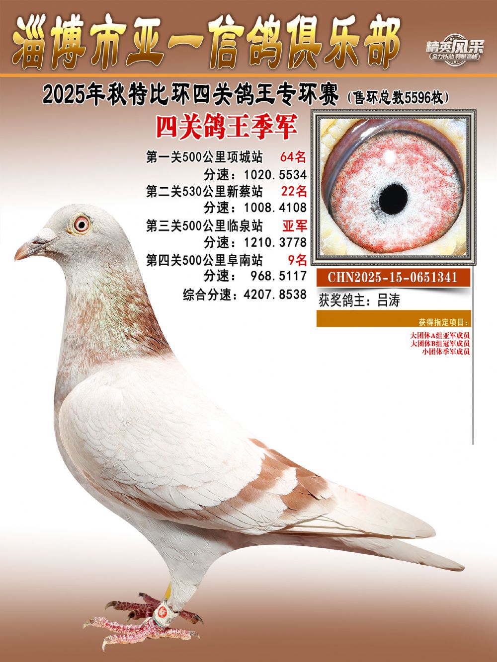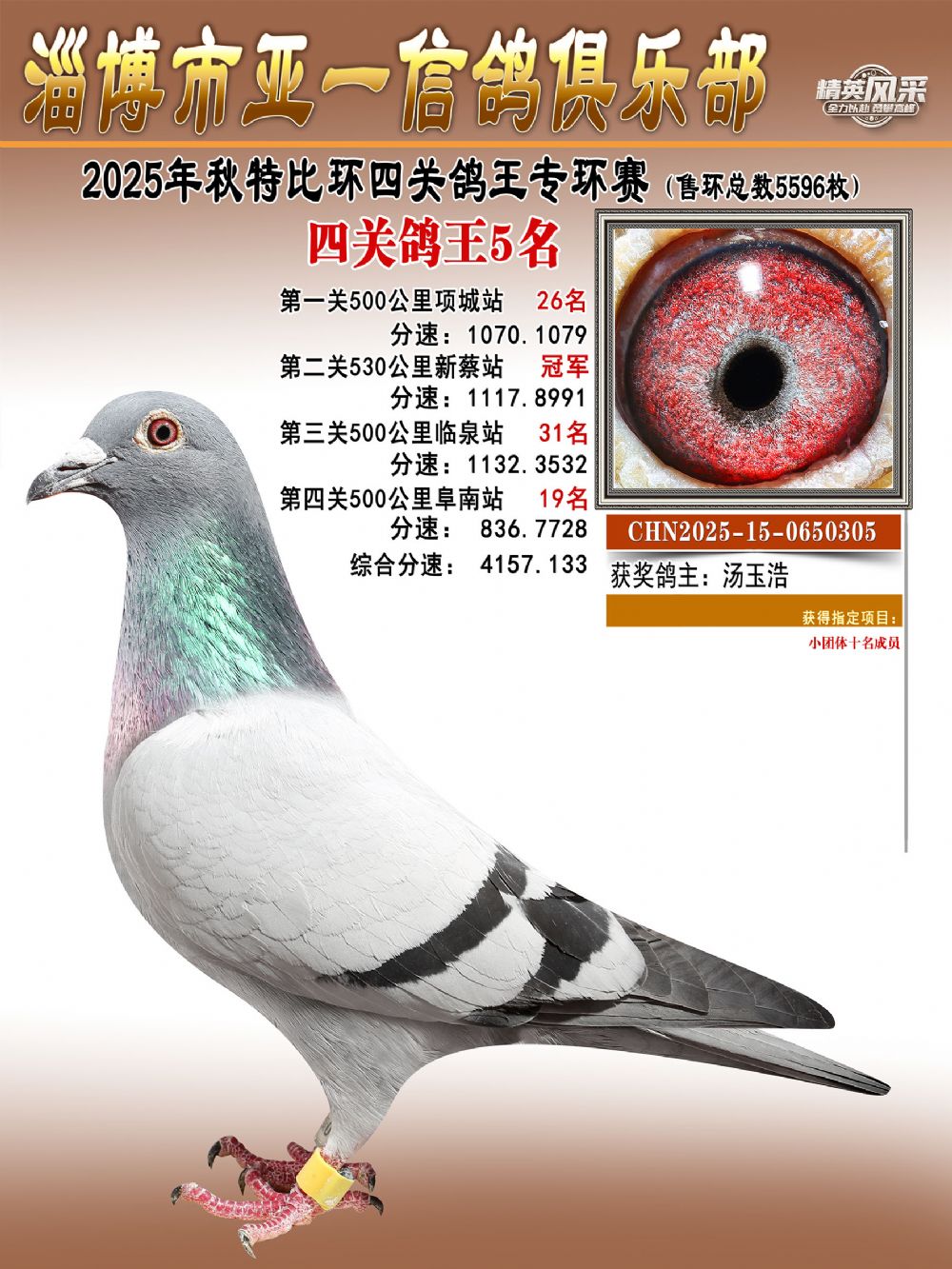 大特比鸽王冠军(精英赛):由金达赛鸽-张开村鸽友名下一羽麒麟花鸽摘得,环号CHN2025-15-0610603。这羽战将四战500公里,四次闯入前百——首关勇夺第44名,二关稳居第83名,第三关强势爆发揽获亚军,第四关再展锋芒,斩获第17名。最终,它以4265.5660米/分的总分速毫无悬念地问鼎本届鸽王总冠军。