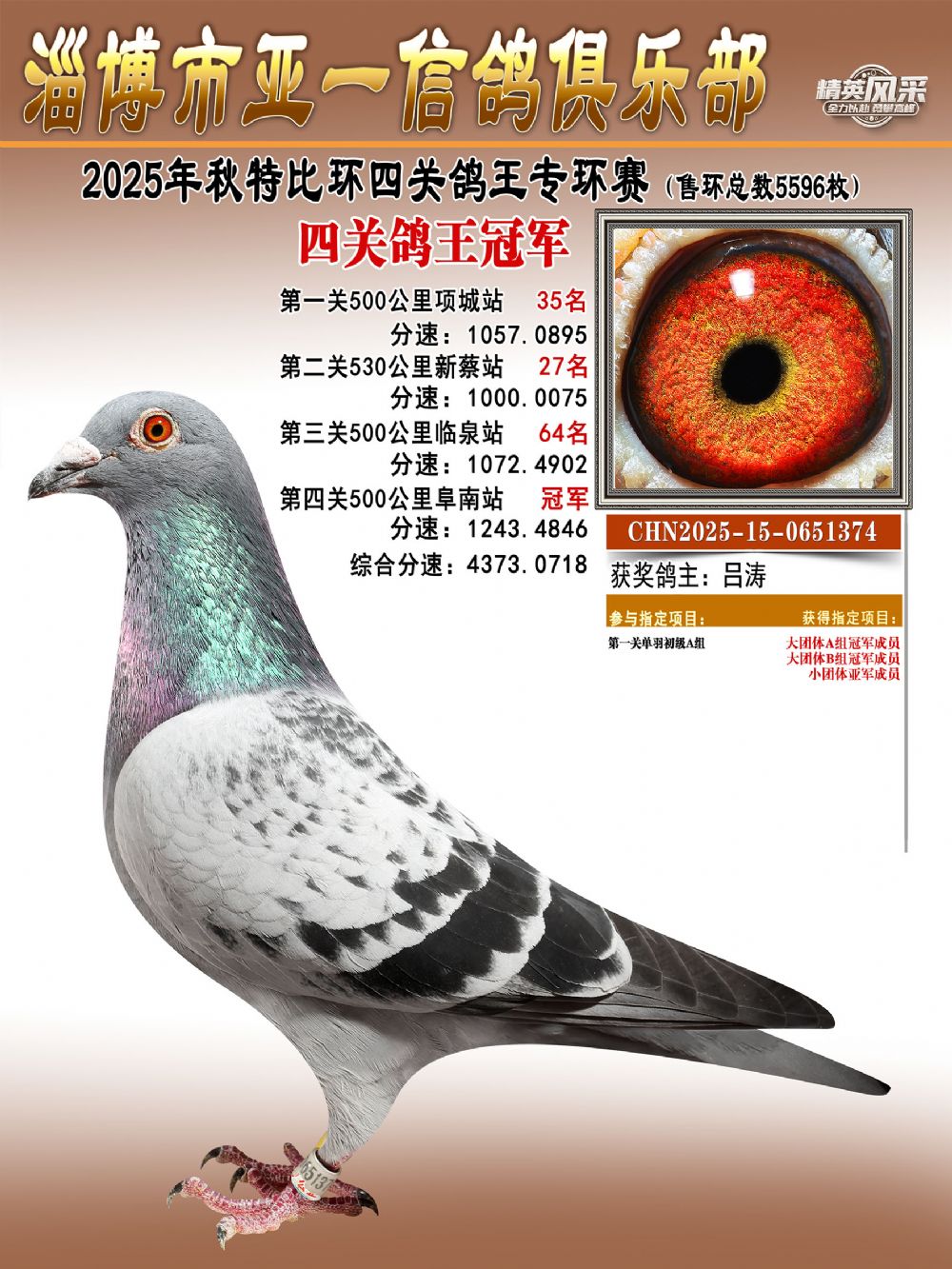 小特比鸽王冠军(幼鸽专环):由吕涛鸽友名下一羽CHN2025-15-0651374灰鸽强势夺得。此鸽首关获第35名、次关跃升至第27名、第三关稳居第64名,第四关更是一鸣惊人,勇夺冠军!此鸽凭借4373.0718米/分的综合分速,以绝对优势捧回鸽王奖杯,为主人赢得大奖。