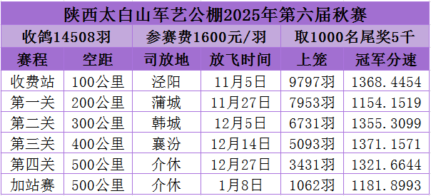 新年钟声起,凯歌震云霄——历时两个月的激烈角逐,陕西太白山军艺公棚2025年第六届秋季赛事于1月初圆满收官。飞越东北黄金赛线,历经多轮淬炼,从百公里资格站起步,依次征战200公里第一关、300公里第二关、400公里第三关,直至500公里终极决赛,最终共有1589羽精英赛鸽成功完成全部四关挑战,荣耀归巢。赛事热度未减,挑战再度升级!紧随其后的500公里加站赛在介休鸣锣开赛,一羽红轮战将惊艳全场,强势摘得加站赛桂冠。
