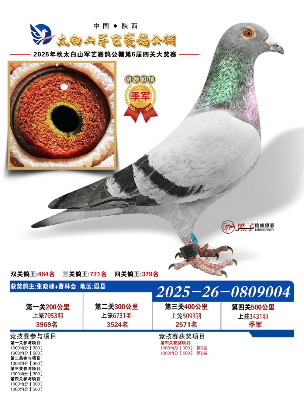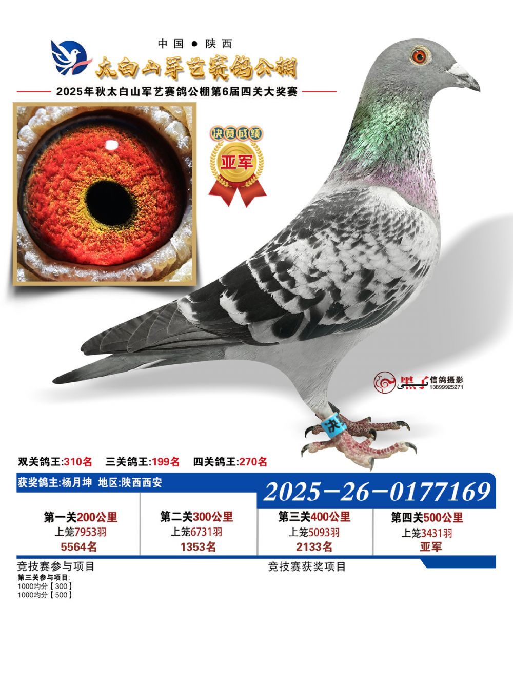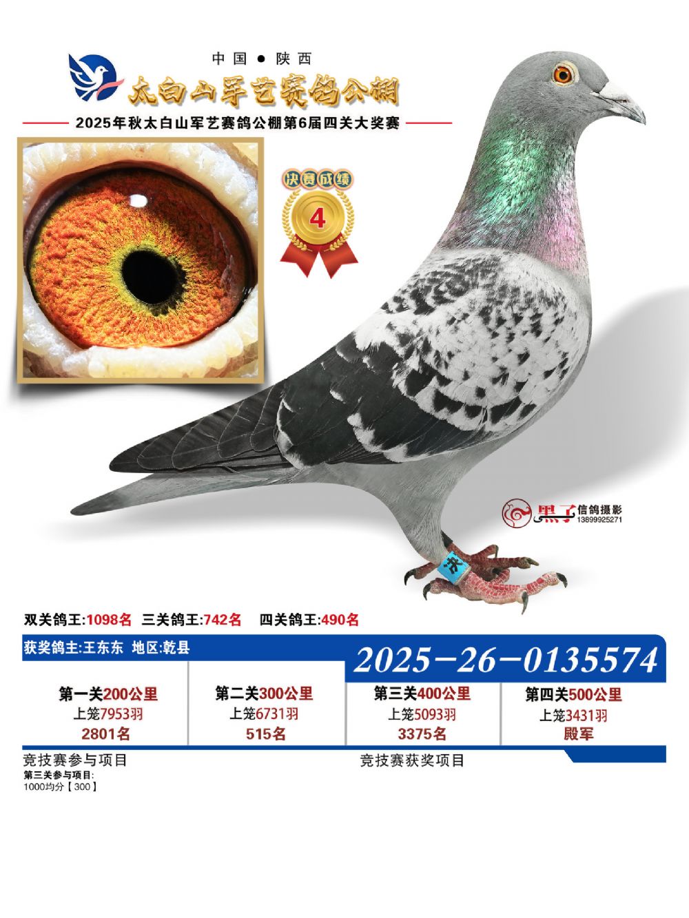 本届秋赛涌现出两员非凡猛将,以决赛冠军最为耀眼。此鸽出自登铭赛鸽—陈甫生+陈友登名下,环号2025260768494,不仅以绝对优势问鼎500公里决赛冠军,更凭借全程稳定发挥,一举斩获四关鸽王季军,锋芒难挡。而四关鸽王总冠军则由孙述祥麾下灰鸽强势摘得,环号2025260763355。该鸽表现极具韧性与爆发力:第一关位列第1116名,第二关跃升至第178名,第三关位居第562名,至第四关强势冲刺至第13名!全程两次关键爆发,尤其在最后一役实现惊人突破,以综合最佳成绩登顶鸽王冠军宝座,实至名归。