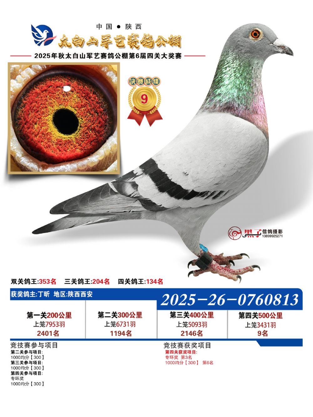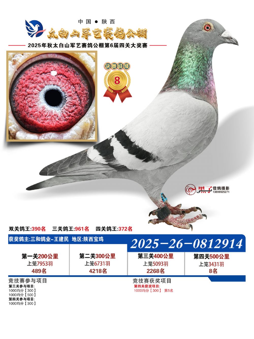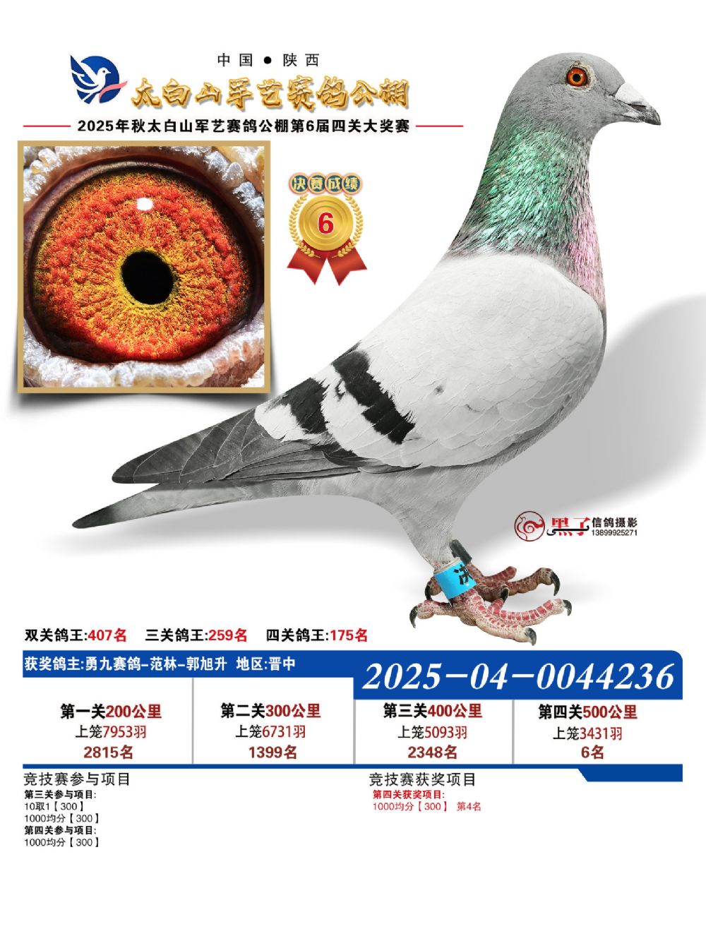 本届秋赛涌现出两员非凡猛将,以决赛冠军最为耀眼。此鸽出自登铭赛鸽—陈甫生+陈友登名下,环号2025260768494,不仅以绝对优势问鼎500公里决赛冠军,更凭借全程稳定发挥,一举斩获四关鸽王季军,锋芒难挡。而四关鸽王总冠军则由孙述祥麾下灰鸽强势摘得,环号2025260763355。该鸽表现极具韧性与爆发力:第一关位列第1116名,第二关跃升至第178名,第三关位居第562名,至第四关强势冲刺至第13名!全程两次关键爆发,尤其在最后一役实现惊人突破,以综合最佳成绩登顶鸽王冠军宝座,实至名归。
