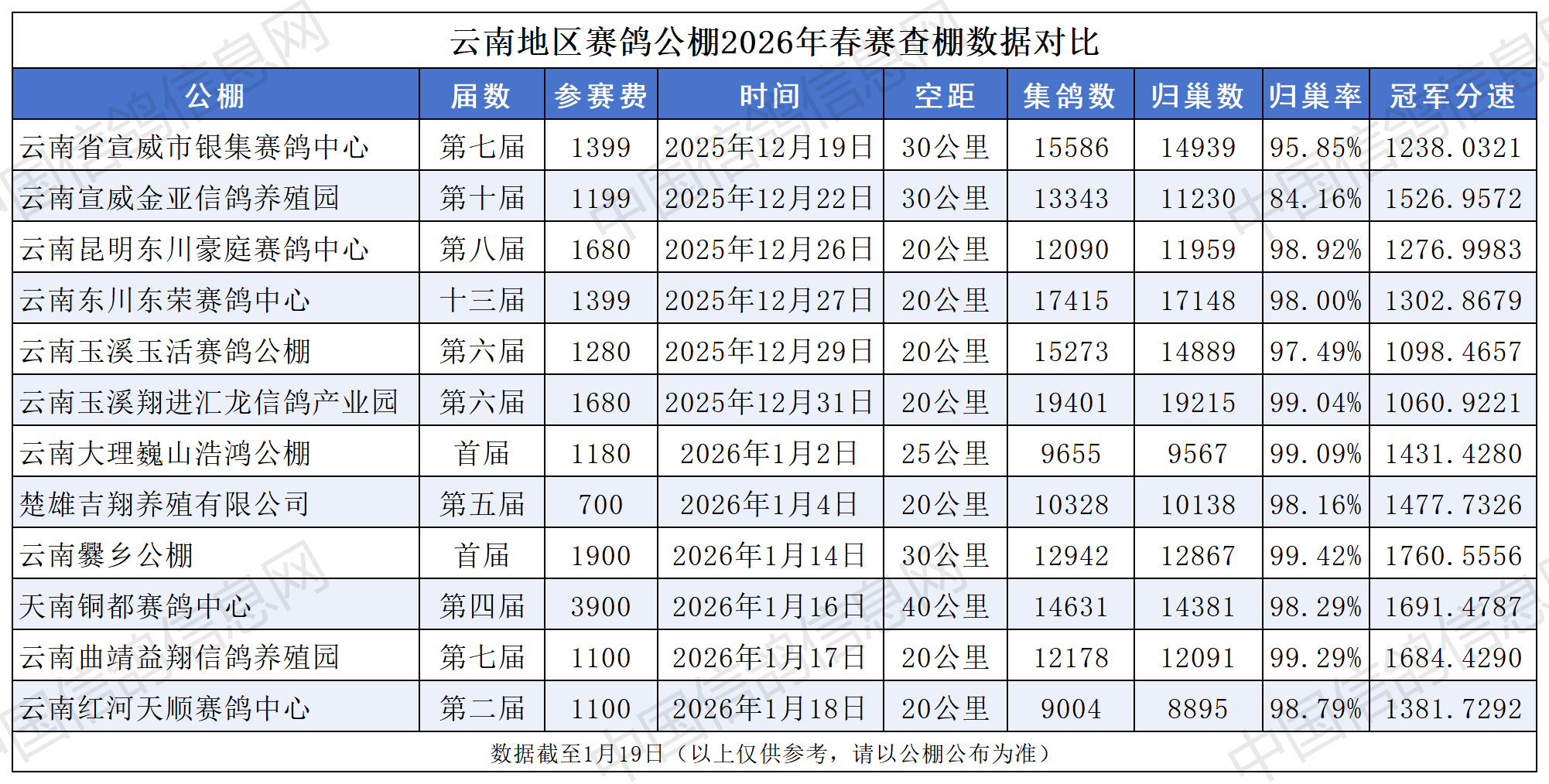 和去年不一样的是,今年的云南春棚来了两个新面孔,云南爨乡、大理巍山浩鸿均是首次办赛,查棚归巢率虽高,但笔者特意去查了存棚率,分别为62.35%与60.37%,养功还需继续加强。