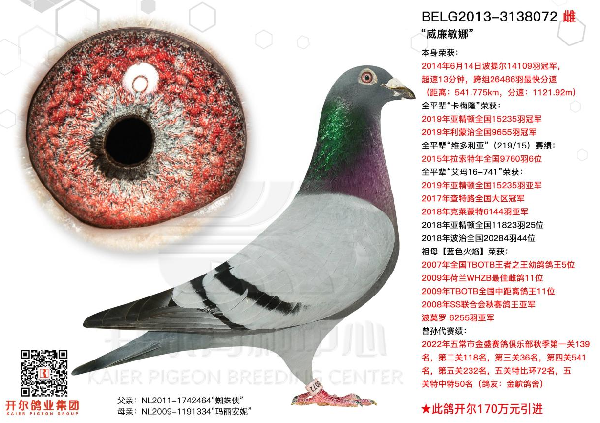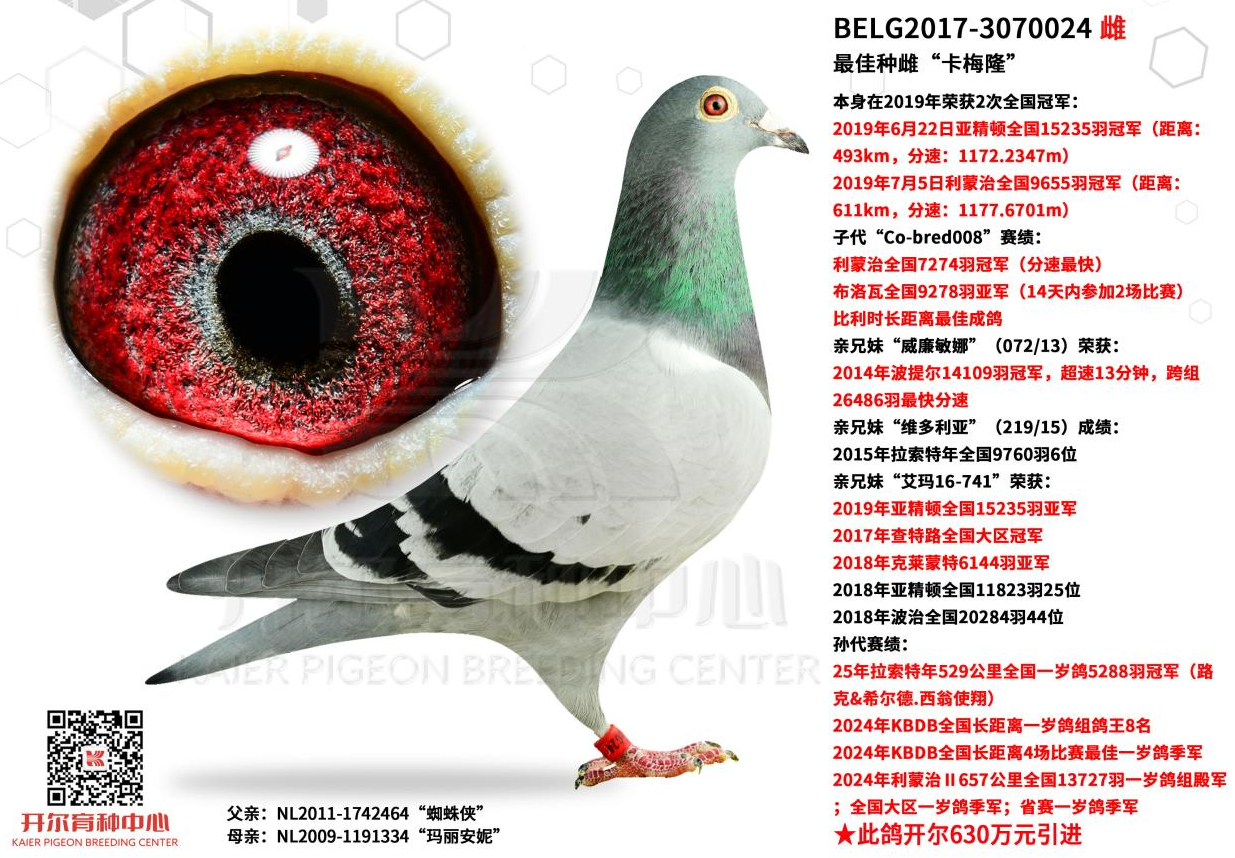 她直接作出子代“008”几乎复刻母亲神迹,14天内连续获得利蒙治全国7274羽冠军、布洛瓦全国9278羽亚军!孙代在24年登顶KBDB全国长距离一岁鸽王8位,全国长距离4场比赛最佳一岁鸽季军,在25年获得拉索特年全国冠军!曾孙代获得同场拉索特年全国亚军!而就在近期,国内鸽友使翔卡梅隆又一后代,夺得红枫小棚决赛殿军。