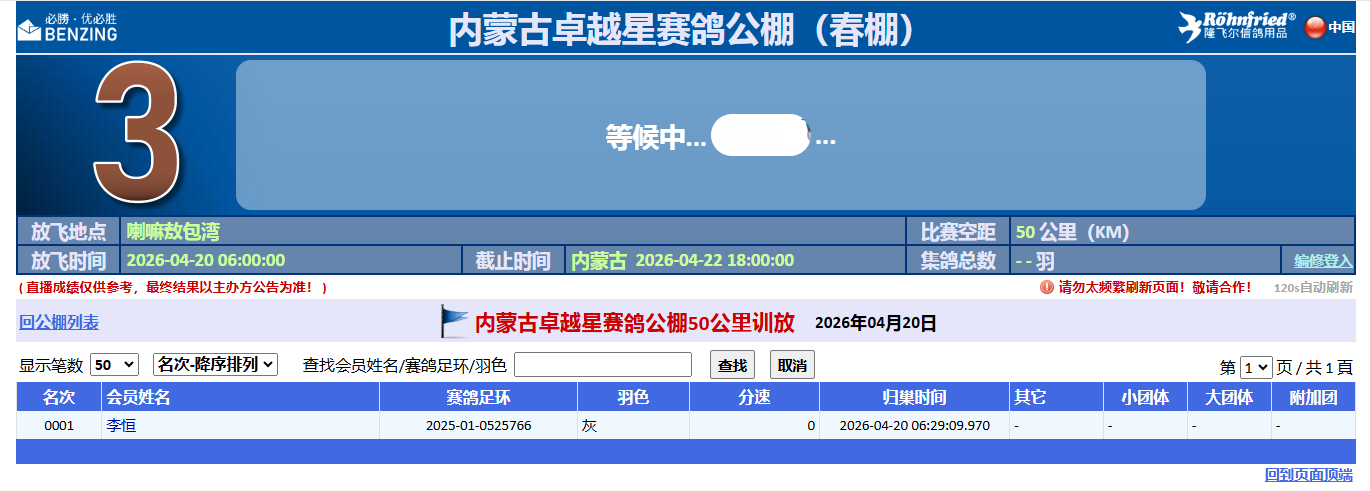 4月20日早6点,内蒙古卓越星赛鸽公棚(春棚)开启50公里短训,在喇嘛敖包湾放飞。截至下午16点10分,整整过去10小时,仅有来自李恒鸽友名下2025-01-0525766灰鸽归巢。