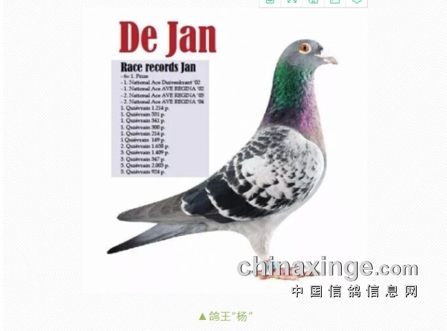 爱亚卡普的超级种鸽“罗西”出自“小灰115”,多位荷兰豪强引进他的鸽子后,频频创造出NPO全国冠军的佳绩。威廉·狄布恩就是其中一位,每年赛季一结束,他就会赶回老爷子那里为自己的鸽舍补充新的血液。国内鸽友熟知的夏拉肯先生,在几年前已开始引进哈森栋克的鸽子了。法国、荷兰、德国的鸽友更是慕名而来,为求一羽优秀的种鸽不惜重金。