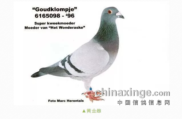而另一羽杰出赛雌B95-6296954在利奥鸽舍作出的三代子孙中有:大名鼎鼎的“黄金雄”、“148/99号”(5夺冠)、“克莉丝”(全国鸽王冠军)、“神奇鸽王”(比利时最佳雌鸽)、“444/00号”(7夺冠)和“166号”(9夺冠)。这两羽优秀种雌让利奥在1998年迎来赛绩大爆发。