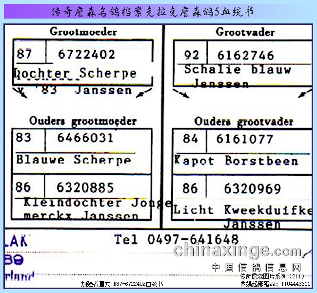母亲鸽B86-6320885的上代版本众多,并没有看到詹森兄弟亲手开的血统书为证,但单单这羽B86-6320885这羽母鸽本身在87年的配公就有两羽,一羽是加强者,另一羽则是小火箭,一年配两公也无可厚非,但詹森兄弟开的血统书中有一羽种鸽就是这两个父亲,这羽鸽子就是B87-6337115,这羽鸽子就是詹森兄弟楼下8对种鸽的其中一羽母鸽,两个父亲但都是詹森兄弟开的血统书,一会开的血统书是加强者,一会开的血统书是小火箭,以后介绍这羽鸽子的时候再作讨论吧。