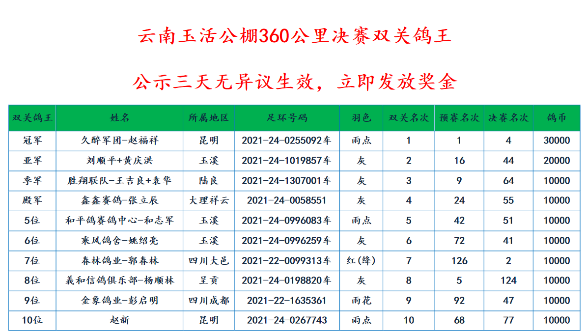 预赛冠军、决赛再获4名,双关鸽王冠军。