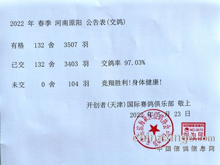 5月23日中午12时,2022年天津开创者春季一岁鸽全球精英四关挑战赛第三关集鸽工作在开创者国际赛鸽俱乐部集鸽大厅正式开始。中国信鸽协会委派本场比赛裁判长国家级裁判-刘为民带队,带领13名来自天津市信鸽协会的裁判员和开创者国际赛鸽俱乐部全体工作人员参与此次集鸽工作。至下午17时50分集鸽工作正式结束,共计132家鸽舍的3403羽参赛鸽上笼参赛,交鸽率达97.03%。