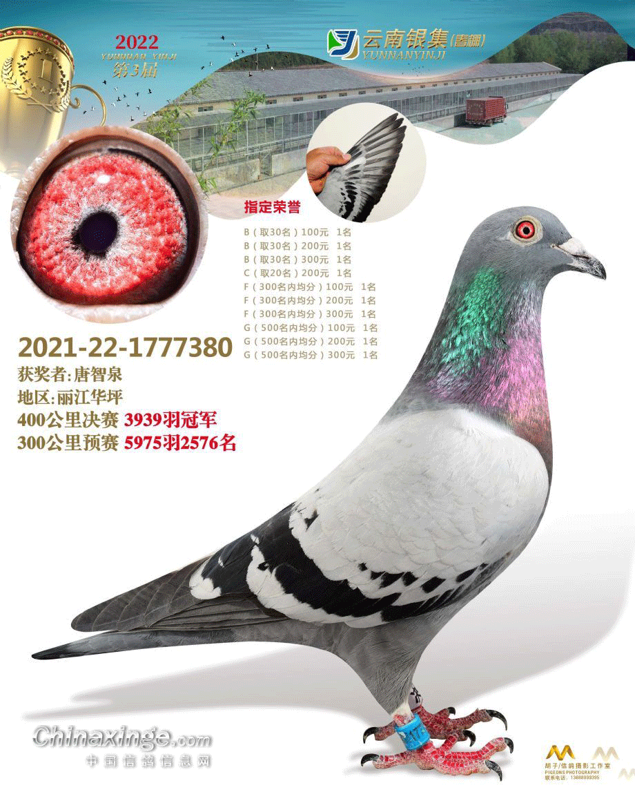 云南宣威银集春棚2022年的三场比赛都飞出超高分速,200公里速度赛冠军1903米/分,300公里预赛冠军1811米/分,400公里决赛冠军1854米/分。丽江唐智泉一羽环号为2021-22-1777380的喷点“封神”,先在速度赛拿下冠军,在预赛中折戟之后,决赛又一次爆发,获得冠军,成就超速“双冠王”伟业。