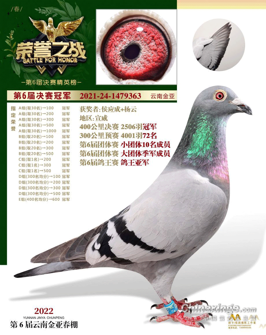 这羽“神奇小鸟”环号2021-24-1479363,宣威侯应成+杨云在云南金亚春棚的参赛鸽。五次训赛,飞了四场高分速,一场艰难决赛,全在百名之内,拿下几十项指定成绩:百公里70名、150公里72名、200公里速度赛亚军、300公里预赛72名、400公里决赛冠军!荣获双关鸽王亚军、三关鸽王冠军、四关鸽王冠军、五关鸽王冠军等头衔。