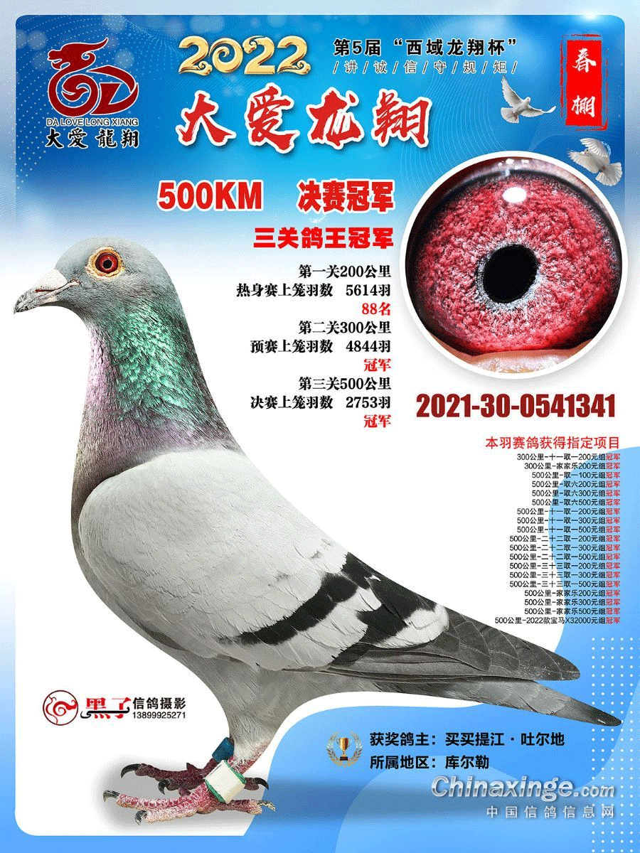 新疆库尔勒鸽友买买提江·吐尔地的21-30-0541341灰鸽,是今年新疆大爱龙翔春棚最闪亮的一颗星,三场比赛,都是处在归巢鸽的第一集团:第一关200公里落后冠军2分钟获得88名,第二关300公里领先2分钟夺得冠军,第三关500公里又领先3秒钟,获得冠军、三关鸽王冠军。
