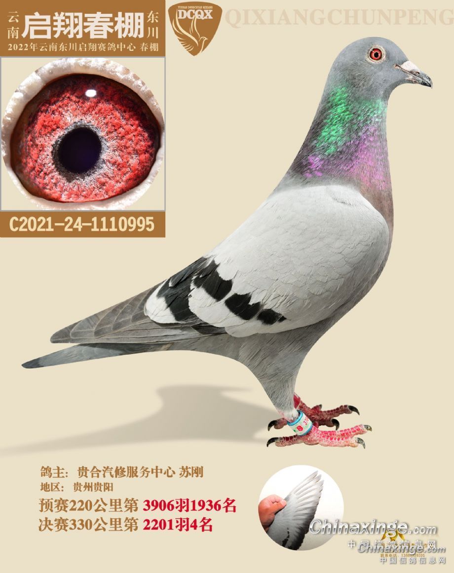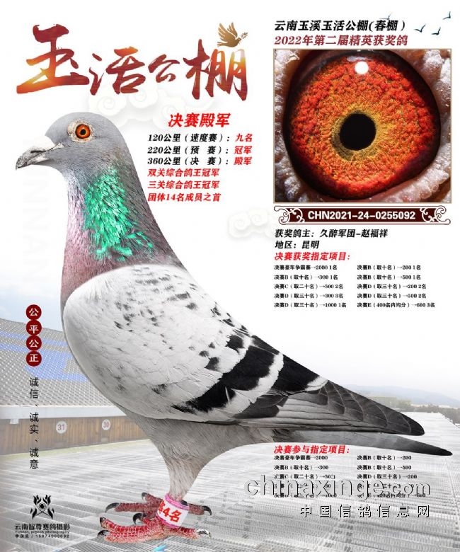 它是一羽雨点,环号2021-24-0255092,鸽主是昆明的久醉军团-赵福祥,在云南玉溪玉活公棚2022年春赛中,120公里训放赛中获得第九名,220公里预赛赢得冠军,380公里决赛拿下4名,同时将双关鸽王冠军收入囊中。