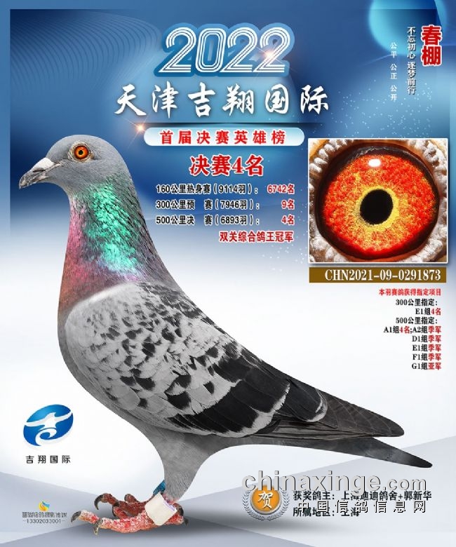 天津吉翔春棚2022年首届赛事,热身赛9114羽、预赛7946羽、决赛6893羽,三关比完依然存棚超4000羽,大羽数、高归巢率,让鸽友们玩得开心,打得过瘾!上海迪迪鸽舍+郭新华的2021-09-0291873雨点黄眼赛鸽,热身赛短距离未发挥好,但厚积薄发,后两场连续入围前10名,分别拿下预赛9名、决赛4名,赢得双关鸽王冠军。