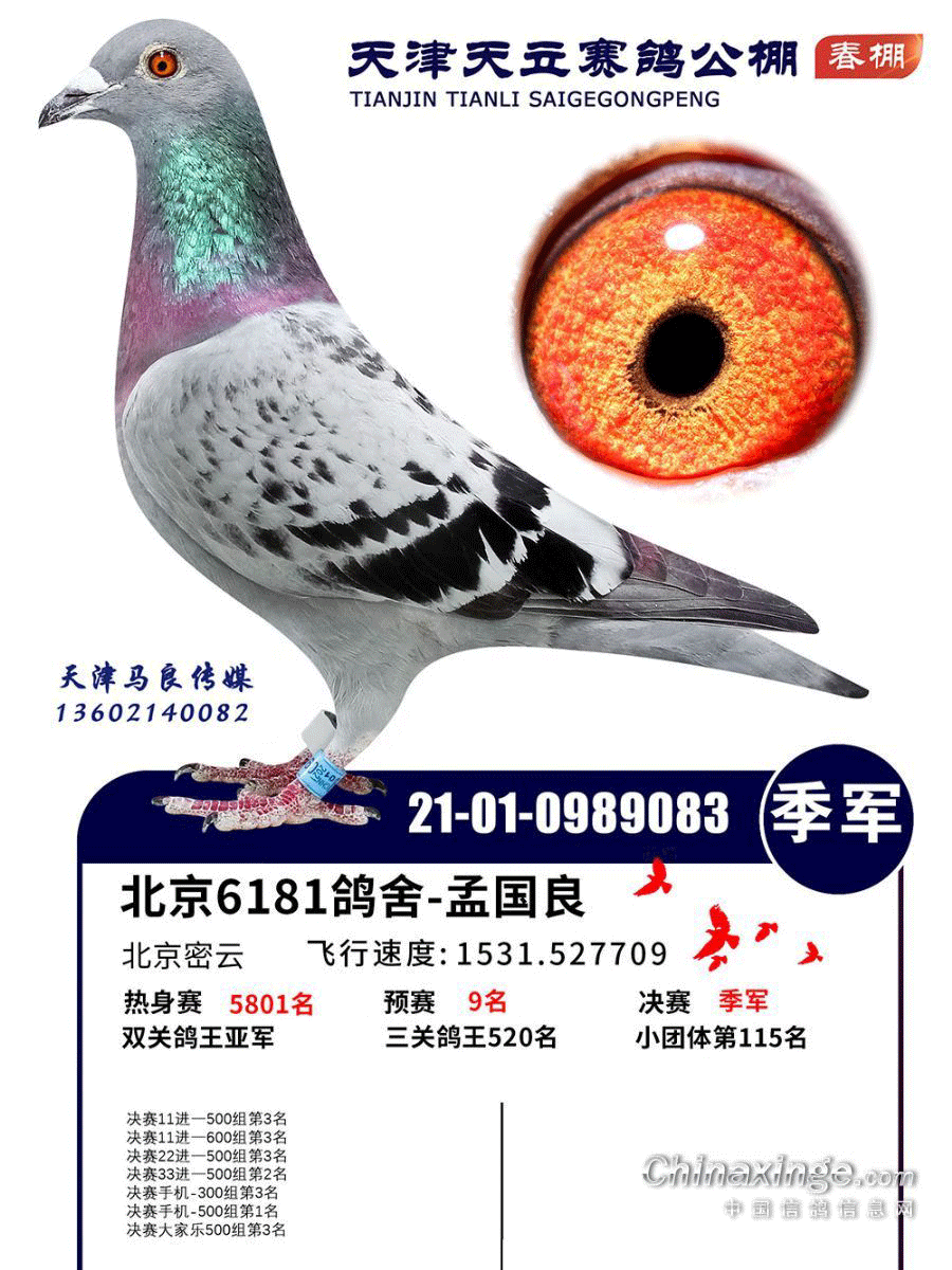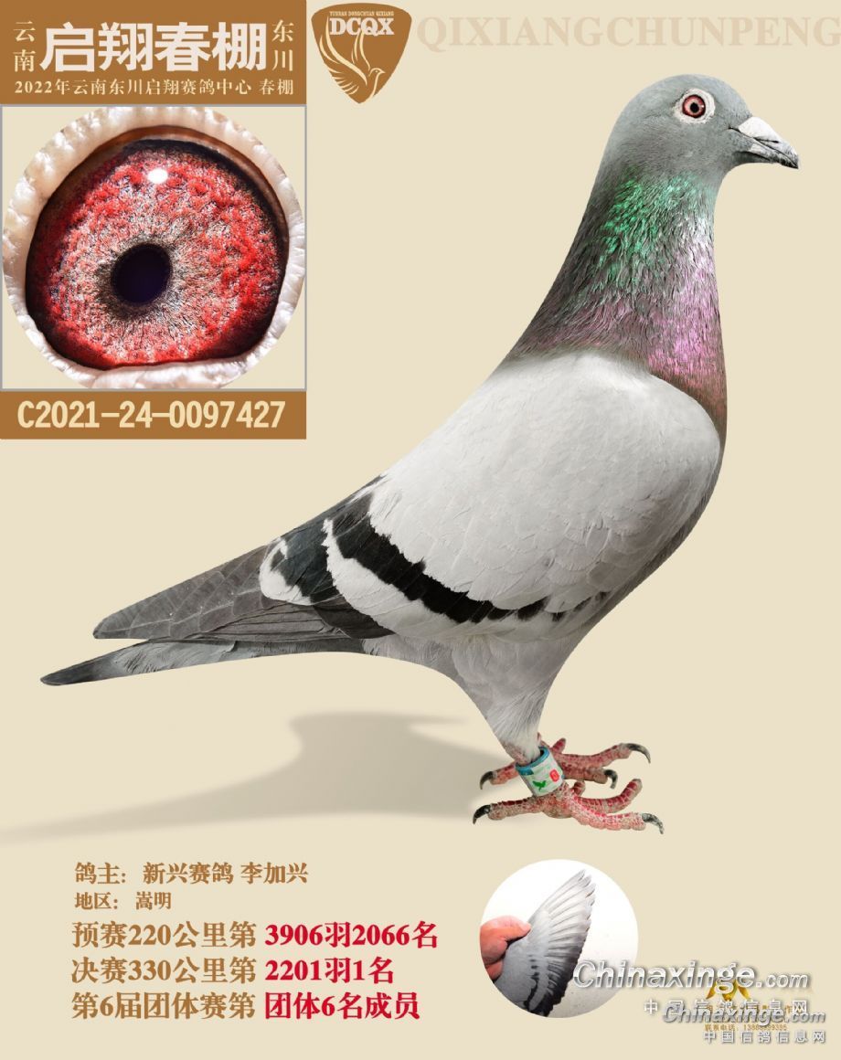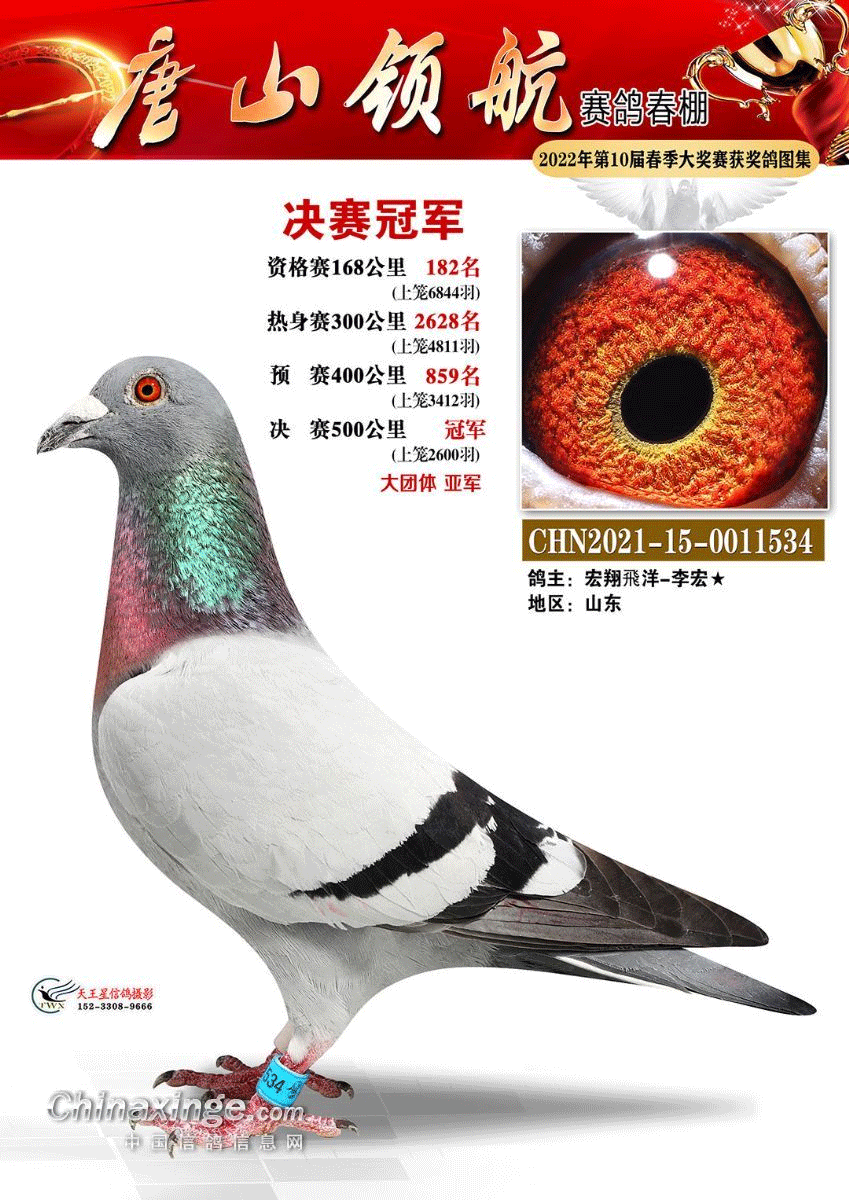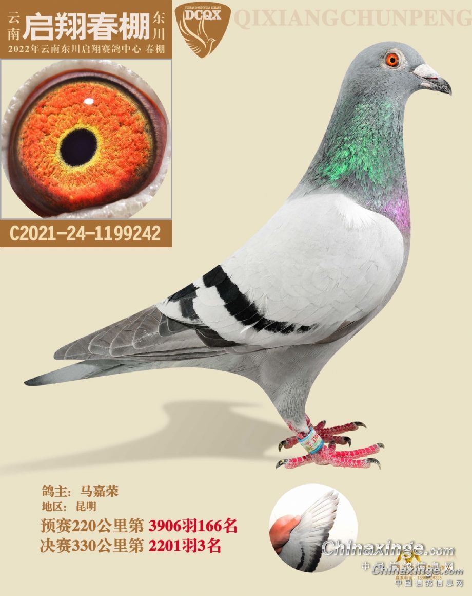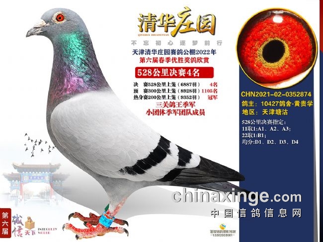 这羽“神鸟”是天津清华庄园2022年第六届春赛的参赛鸽,鸽主是天津10427鸽舍-黄贵学,获得200公里热身赛最大羽数9352羽冠军,300公里预赛打了个盹,仅获得1105羽,不过决赛它再次冲到最前面,获得6887羽殿军,成为今年公棚的最佳之一。