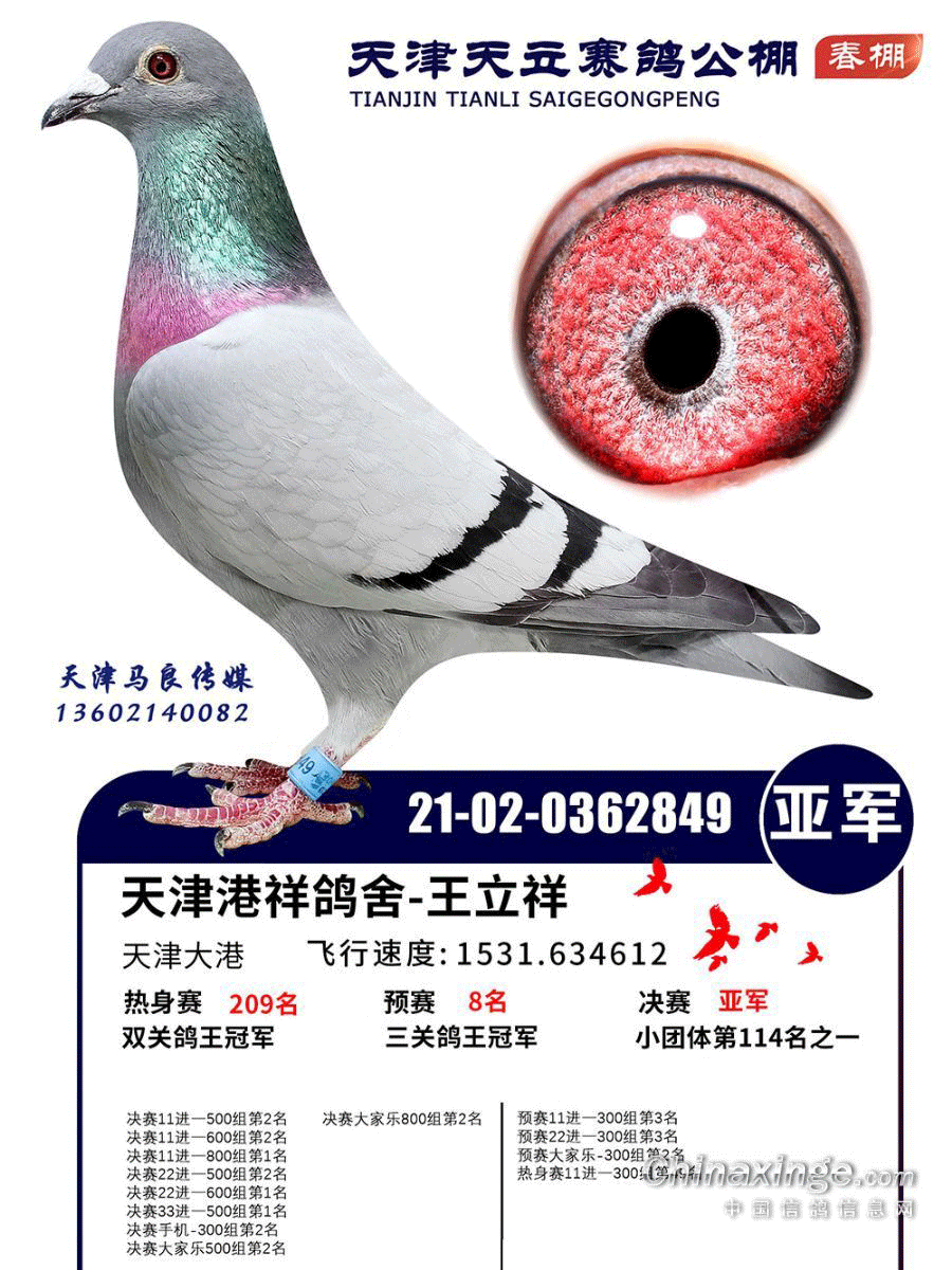 天津天立春棚收鸽18000多羽,热身赛上笼10000多羽,预赛上笼7700多羽,决赛上笼3535羽,在这一万多羽鸽子中,有两羽赛鸽特别有缘分:2021-02-0362849灰鸽、2021-01-0989083雨点,他俩预赛一前一后相隔两分钟,分别获得8名、9名。决赛中,更是同一分钟报到,仅相差1秒钟,分别获得亚军、季军。