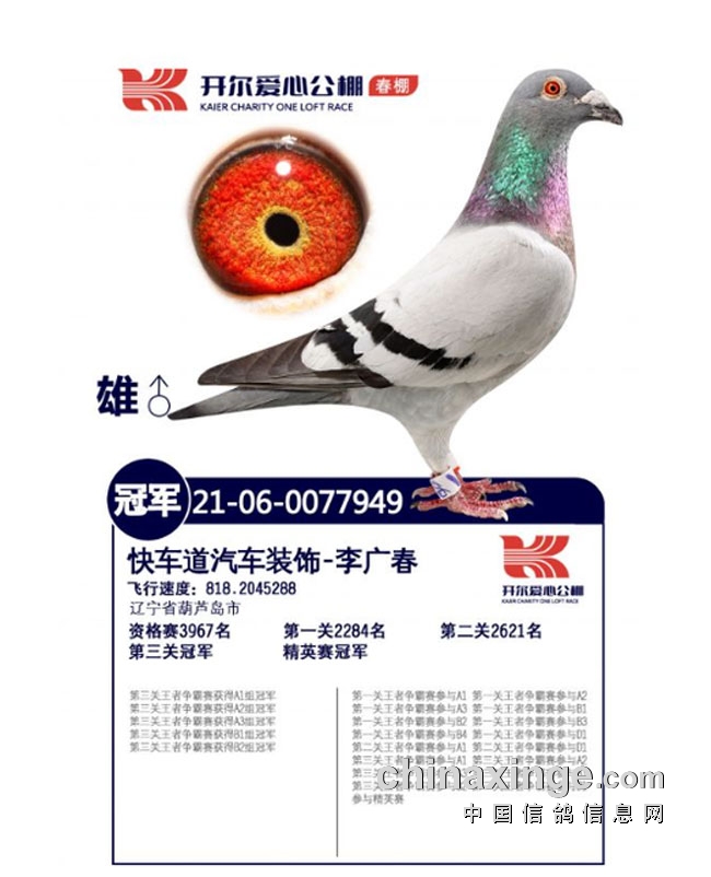 5月21日,唐山市开尔、尼尔森、领航三家春棚同一天举行决赛,共计放飞超过10000羽赛鸽。沿途全程高温逆风,外加地震、降雨,让比赛充满荆棘。三个公棚的冠军都是“超时冠军”,在下午先后归巢,飞行时间长达10小时,其中: