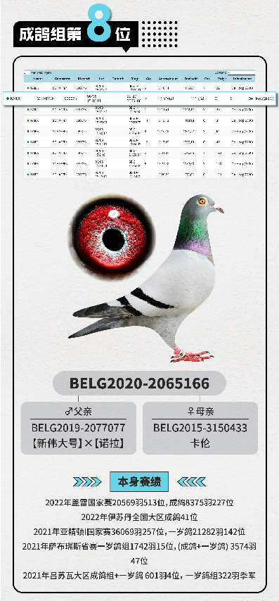 成鸽4003羽8位:BELG2020-2065166。父:BELG2019-2077077新伟大号x诺拉;母:BELG2015-3150433卡伦。BELG2020-2065166在多场赛事中一直表现出色,本身荣获2022年伊苏丹全国大区成鸽41位;2021年亚精顿I一岁鸽21282羽142位;2021年萨布瑞斯省赛一岁鸽组1742羽15位,(成鸽+一岁鸽)3574羽47位;2021年吕苏瓦大区成鸽组+一岁鸽601羽4位,一岁鸽组322羽季军