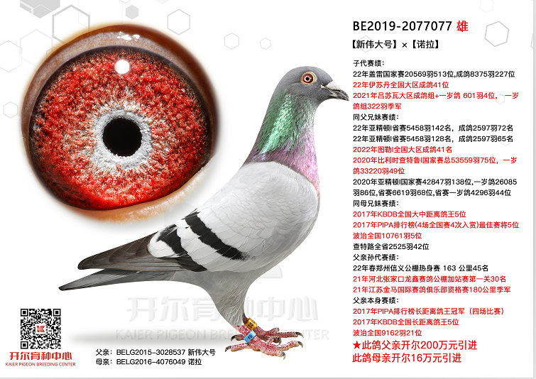 父亲是【新伟大号】配的【诺拉】,【新伟大号】2017年PIPA排行榜长距离鸽王冠军(四场比赛);2017年KBDB全国长距离鸽王5位,【诺拉】出自全省鸽王季军X全国冠军直女。