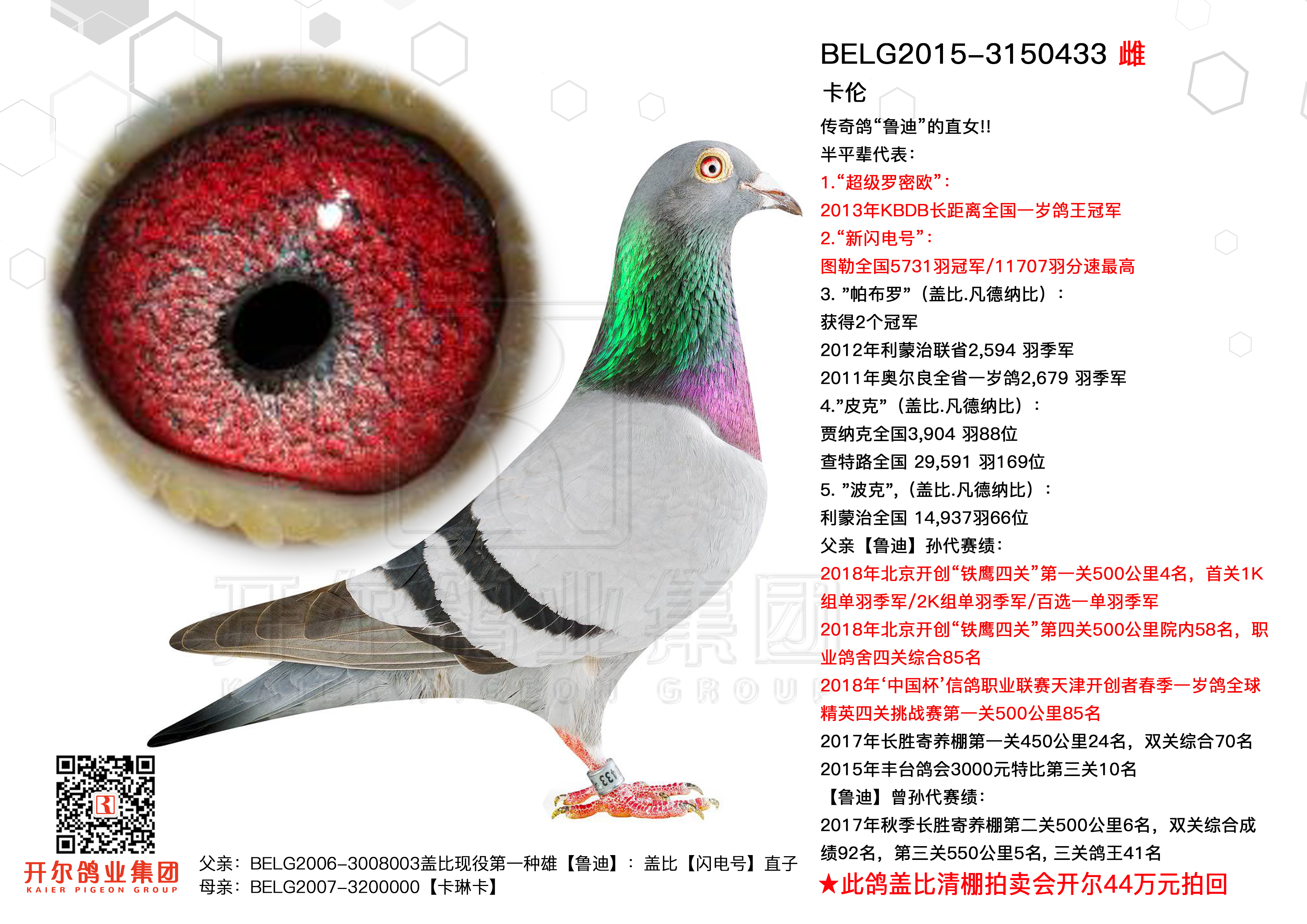母亲BELG2014-3157495卡琳娜为纯盖比·凡得那比血统,出自传奇鸽“鲁迪”与“齐娅娜”的结合,是图勒全国冠军“新闪电号”之全姐妹