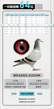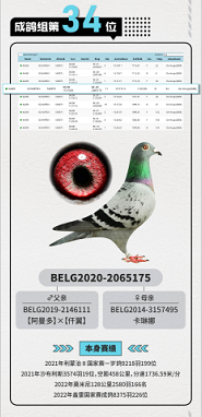 成鸽4003羽34位:BELG2020-2065175。父:BELG2019-2146111【阿曼多】×【仟翼】。母:BELG2014-3157495卡琳娜为纯盖比·凡得那比。BELG2020-2065175曾荣获2021年利蒙治Ⅱ一岁鸽9218羽199位;2021年沙布利斯省赛3574羽19位,空距458公里,分速1736.59米/分