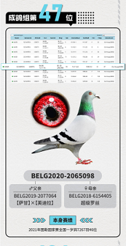 BELG2020-2065098曾获得2021年图勒国家赛全国一岁鸽7267羽46位