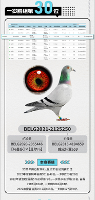 一岁鸽5720羽30位:BELG2021-2125250。父:BELG2020-2065446阿曼多x艾尔玛;母:BELG2018-4194659威寇仟翼659。BELG2021-2125250本身就有着非常不错的成绩,2021年赛迈斯369公里1231羽幼鸽赛21位;2022年拉索特年省赛931羽42名,一岁鸽523羽19名;父亲是阿曼多与艾尔玛的结合,我们知道【阿曼多】是传奇赛鸽是比利时历史上最优秀的当日归长距离赛将,荣获2019年波兹南奥林匹克C组比利时KBDB长距离代表鸽冠军,2018年KBDB全国长距离成鸽王冠军,2017年KBDB全国长距离成鸽王季军;2017年PIPA排行榜2场国家赛比利时最佳长距离赛冠军。