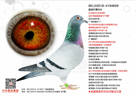 母亲威寇仟翼659是开尔与PIPA菁英育种中心和PEC合作育种,出自“威寇福雷迪”X仟翼,威寇福雷迪为PIPA菁英育种中心卓越种鸽,作育优秀子代代表“保时捷911”在2015年KBDB全国大中距离一岁鸽王5位,大露锋芒,也曾荣获查特路I全国25710羽7位;波治全国21522羽11位;蒙吕松全国16982羽52位;亚精顿I全国大区5327羽38位。