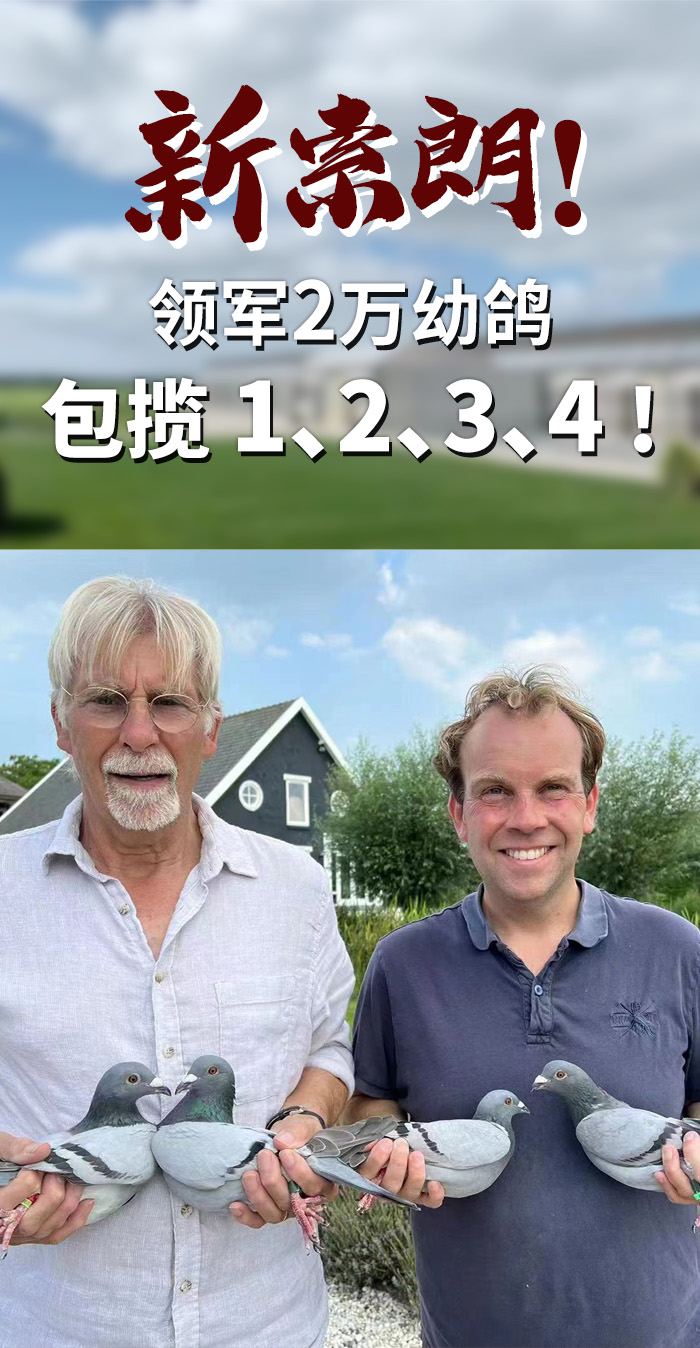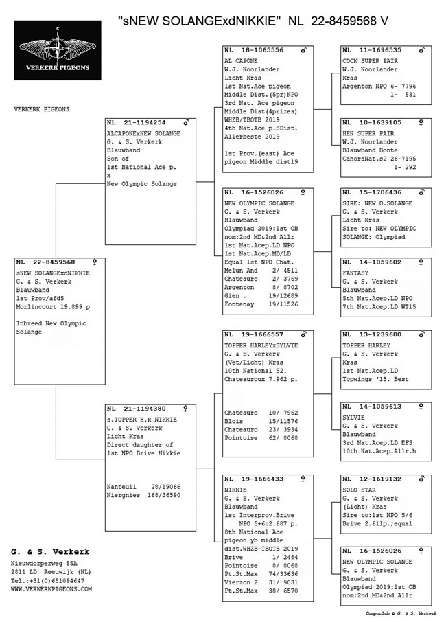 1. NL2022-8459568 | 2022年 默林克尔300公里 | 19899羽 NPO幼鸽赛冠军 > 父亲:NL21-1194254——“新奥林匹克·索朗”直子 > 佛科克“阿尔·卡彭”ד新奥林匹克·索朗”子代,父亲“阿尔·卡彭”获得2019年NPO中距离全国鸽王冠军、WHZB-TBOTB中距离全国鸽王季军等,母亲“新奥林匹克·索朗”获得2019年奥林匹克老鸽组国际鸽王、2018年NPO长距离全国鸽王冠军、WHZB-TBOTB长距离全国鸽王亚军、PIPA中长距离全国鸽王冠军、长距离全国鸽王亚军等。
