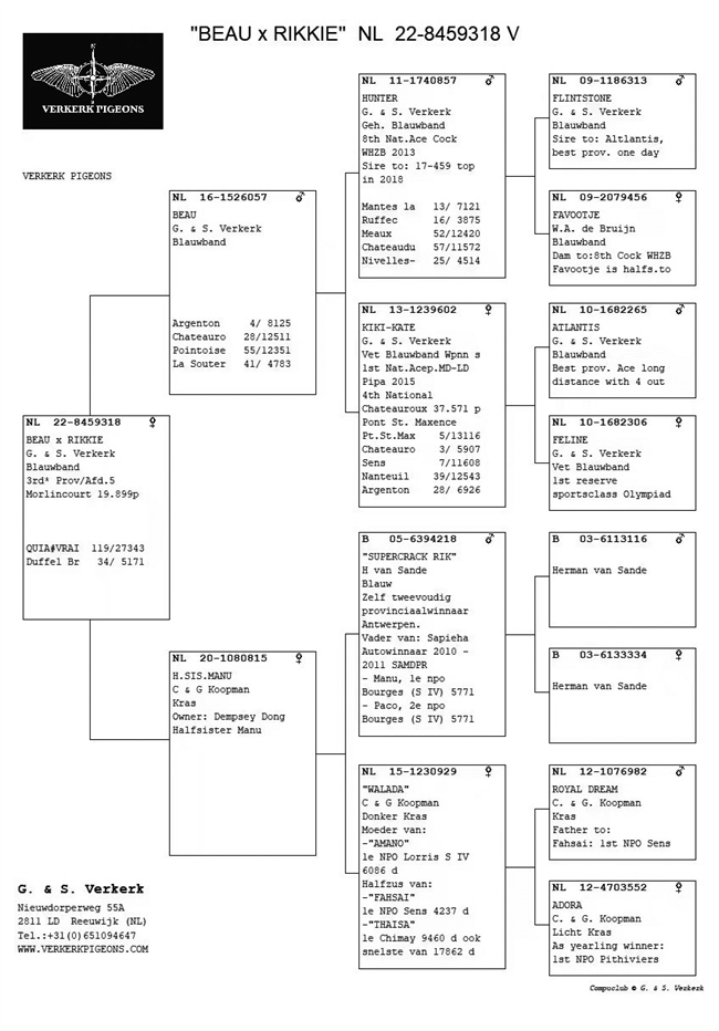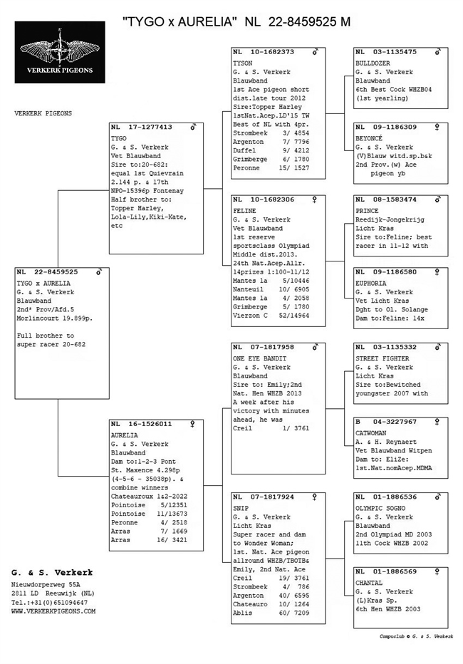 2. NL2022-8459525 | 2022年 默林克尔300公里 | 19899羽 NPO幼鸽赛亚军 > 父亲:NL17-1277413“泰戈”——佛科克“泰森”ד菲琳”子代,作出魁夫兰2177羽冠军、丰特奈15396羽NPO赛17名等,兄弟、姐妹包括“西尔维”、“特一号”、“萝拉-莉莉”、“琪琪-凯特”等众多超级鸽王。